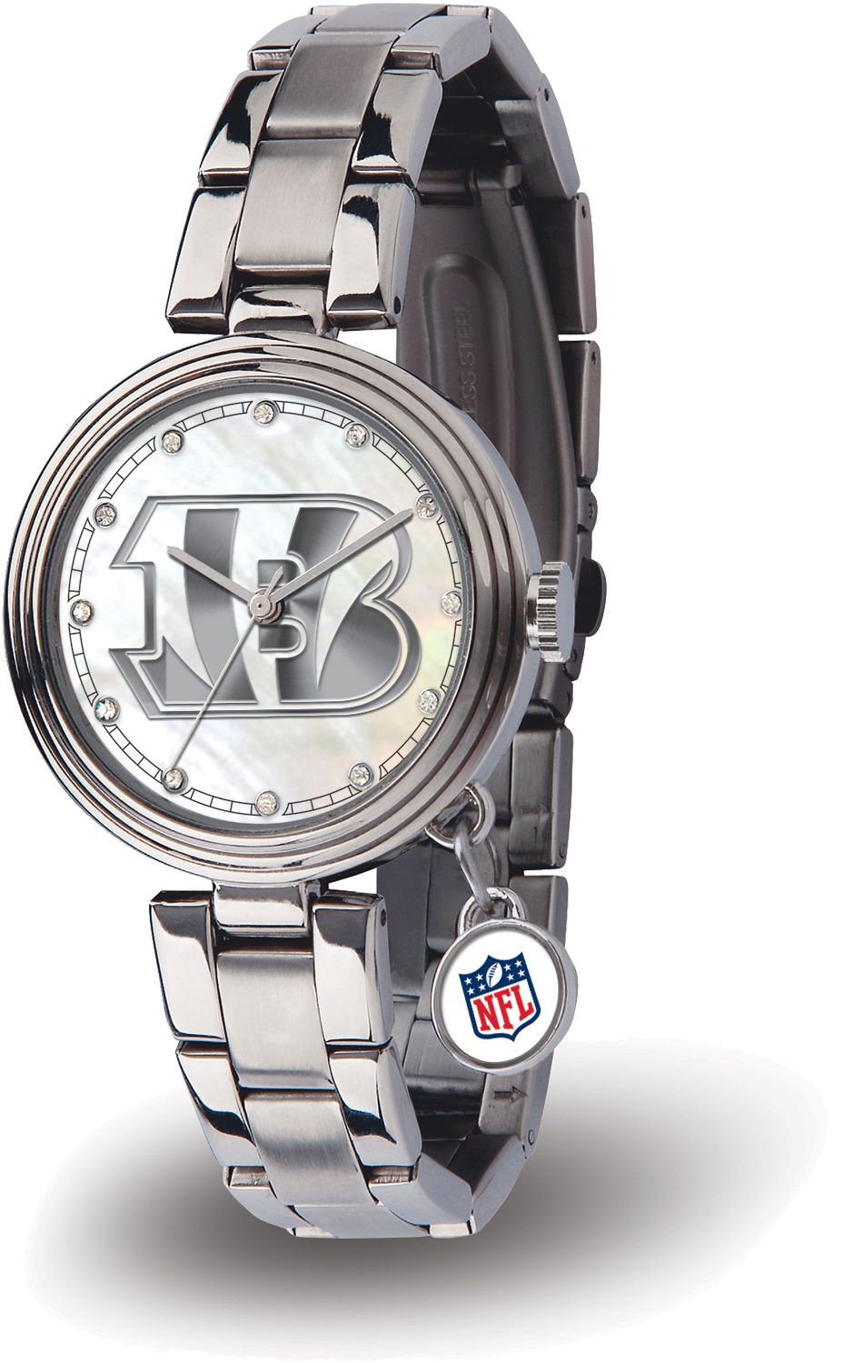Score a touchdown for style with the Sparo® Cincinnati Bengals Charm Watch. The dial of this fashionable watch features a team logo upon a silver-tone inlay background with a scratch-resistant mineral crystal lens. The stainless steel band adds a professional touch, while the dangling crystal charm allows for a feminine look at the game or office. Precision quartz movement on this quality piece ensures you’re always there for game time.