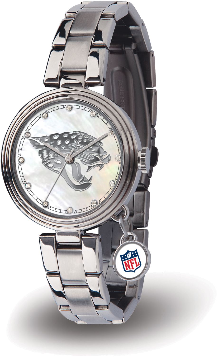 Score a touchdown for style with the Sparo® Jacksonville Jaguars Charm Watch. The dial of this fashionable watch features a team logo upon a silver-tone inlay background with a scratch-resistant mineral crystal lens. The stainless steel band adds a professional touch, while the dangling crystal charm allows for a feminine look at the game or office. Precision quartz movement on this quality piece ensures you’re always there for game time.