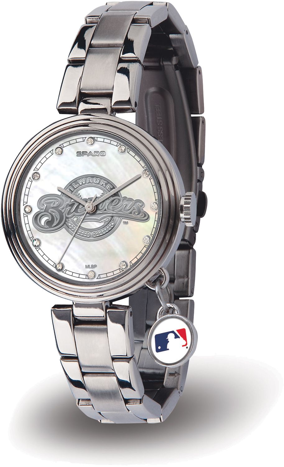 Hit your team pride out of the park with the Sparo® Milwaukee Brewers Charm Watch. The dial of this stylish watch features a team logo upon a silver-tone inlay background with a scratch-resistant mineral crystal lens. The stainless steel band adds a professional touch to your workday outfit, while the dangling crystal charm allows for a feminine look. Precision quartz movement on this quality piece ensures you’re always on time for the game.