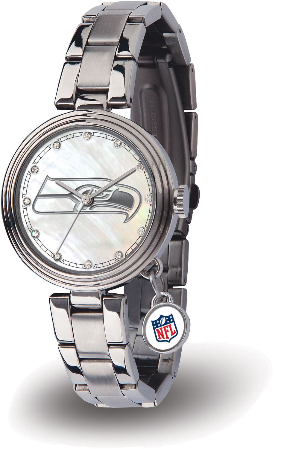 Score a touchdown for style with the Sparo® Seattle Seahawks Charm Watch. The dial of this fashionable watch features a team logo upon a silver-tone inlay background with a scratch-resistant mineral crystal lens. The stainless steel band adds a professional touch, while the dangling crystal charm allows for a feminine look at the game or office. Precision quartz movement on this quality piece ensures you’re always there for game time.