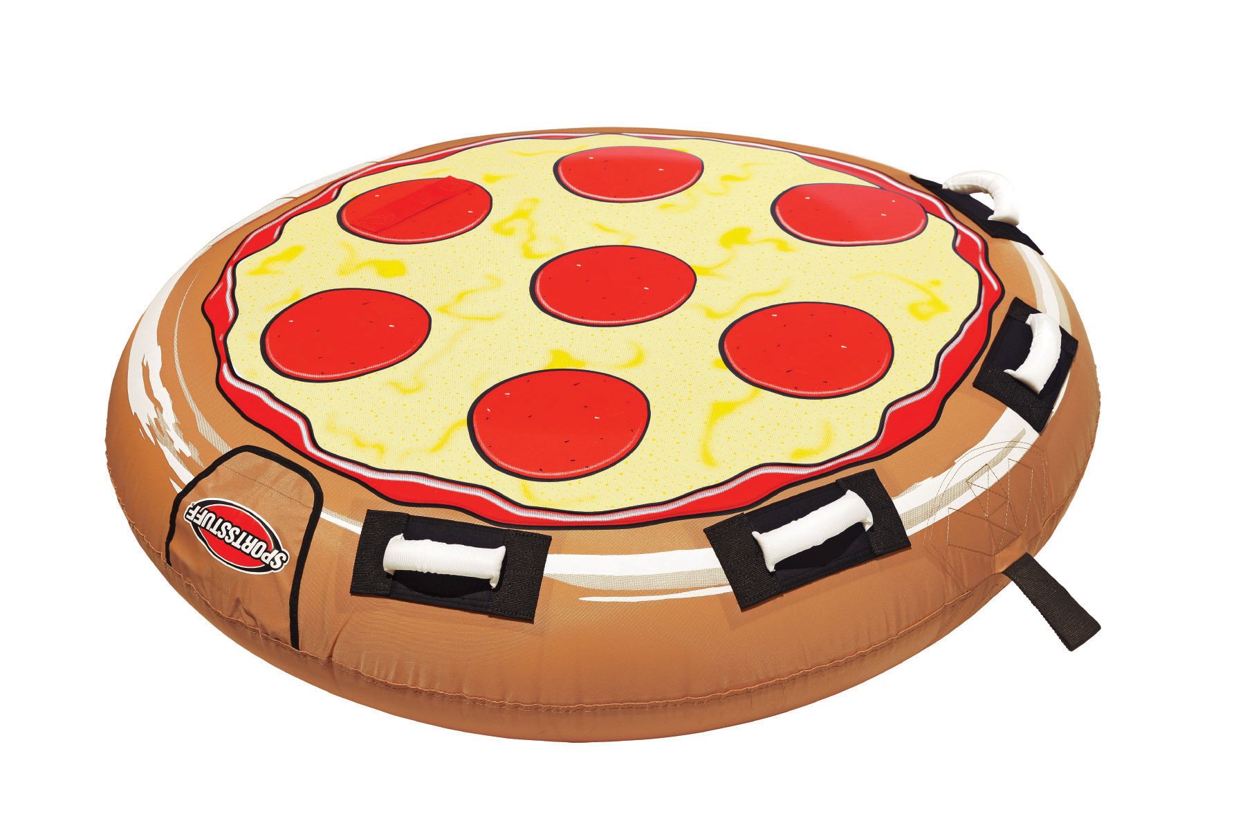 For a yummy ride this boating season, gear up with the Sportsstuff® Pizza 1-Person Towable Tube! This 57” towable tube features a thin-profile, pizza shape for an easy and fun ride out on the river. Its rugged PVC bladder is encased by a heavy-duty double-stiched full nylon cover for durability and strength. Hold on tight to the deluxe double webbing foam handles with neoprene knuckle guards for a comfortable ride and secure grip as your splash through the water on this tasty pizza pie!