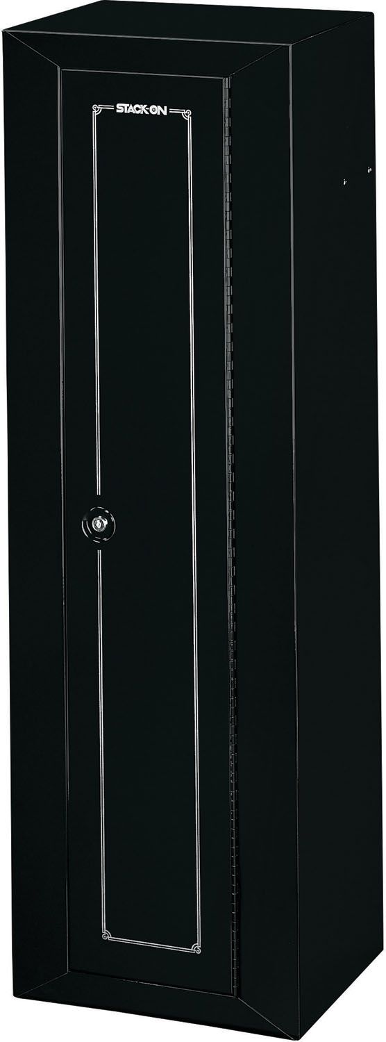 Secure your firearms safely with the Stack-On® 10-Gun Compact Steel Security Cabinet. This safe protects firearms and personal valuables with a three-point locking system and double-bitted key coded lock. Stocked with foam padding on all interior shelves to reduce scratching and marring of guns, the safe is equipped with a key lock and recessed door to provide simple access and exceptional protection. The Stack-On® 10-Gun Compact Steel Security Cabinet has sleek chrome accents with a black finish.