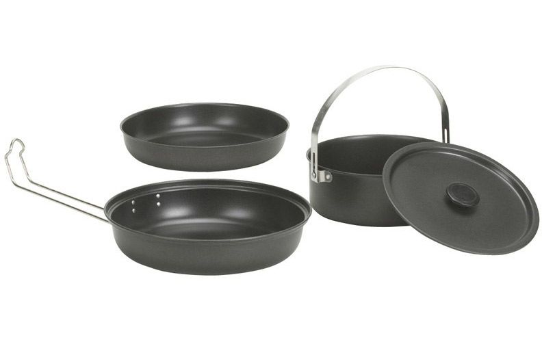 Set up a perfect campsite dinner using the Stansport™ Black Granite™ Steel Mess Kit. Black Granite™ construction withstands temperatures of up to 300°, while a permanent non-stick finish makes cooking and cleanup effortless. The set contains a boiling pot with lid, frying pan with locking handle and steel plate that nests together and easily packs away. Cook like a pro on your next trip with this Stansport™ set.