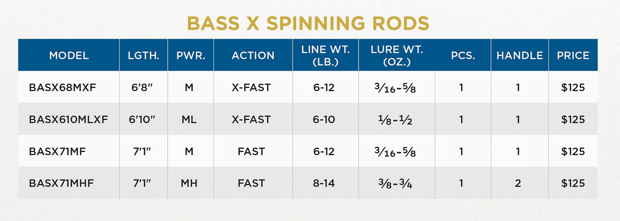 | BASX610MLXF | 6'10" | Medium Light | X-Fast | 6-10 | 1/8-1/2 | 1 |