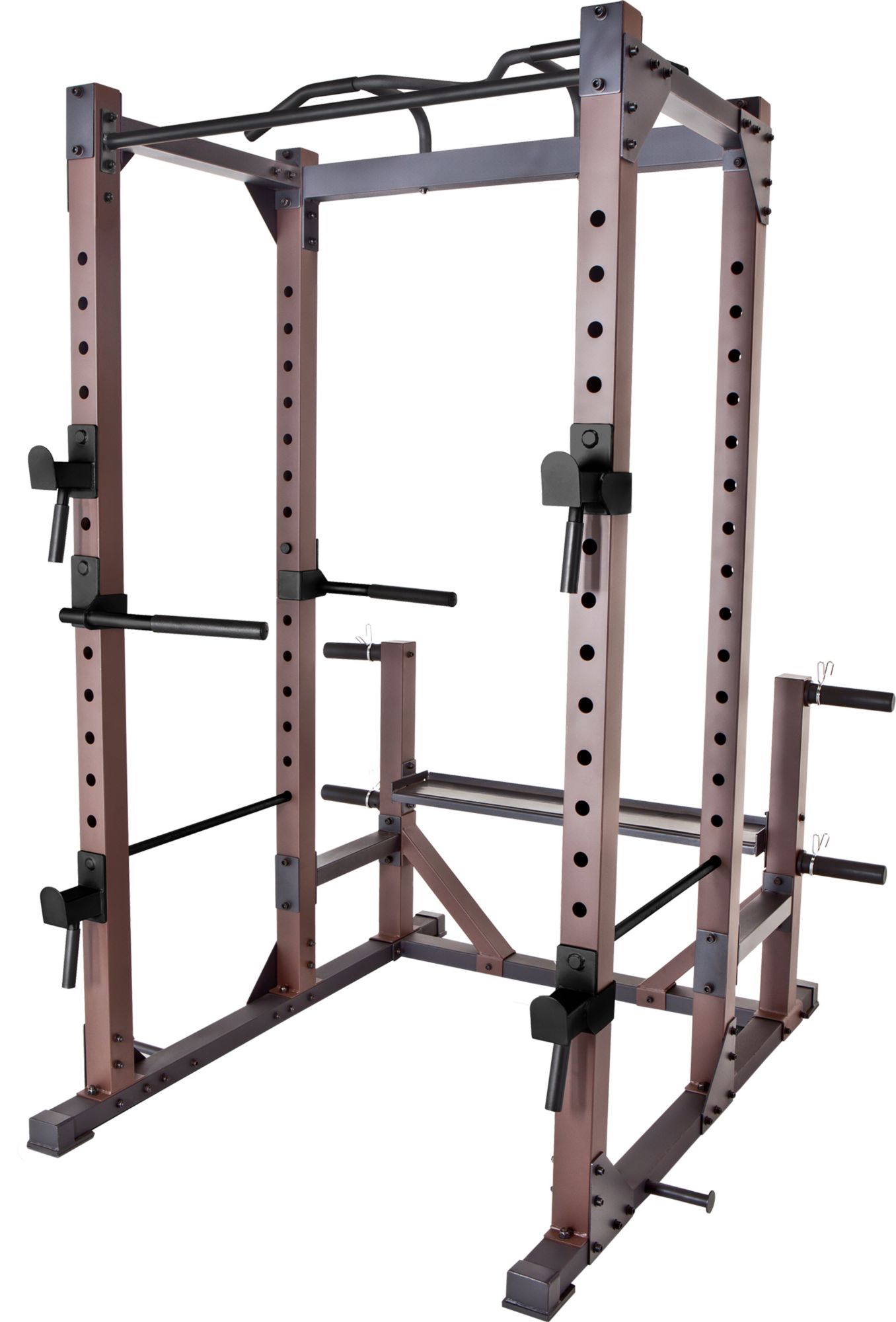 Built for the serious home strength trainer, the SteelBody® Monster Cage offers a durable, customizable rack worthy of a pro weight room. Featuring multi-grip pull-up handles, a kipping station and a dip station, this rack offers a full range of muscle-building exercises. Designed for safety and comfort, this power cage includes easy access weight and safety catches, along with padded pull-up grips. Simply add a bench for a complete home gym.