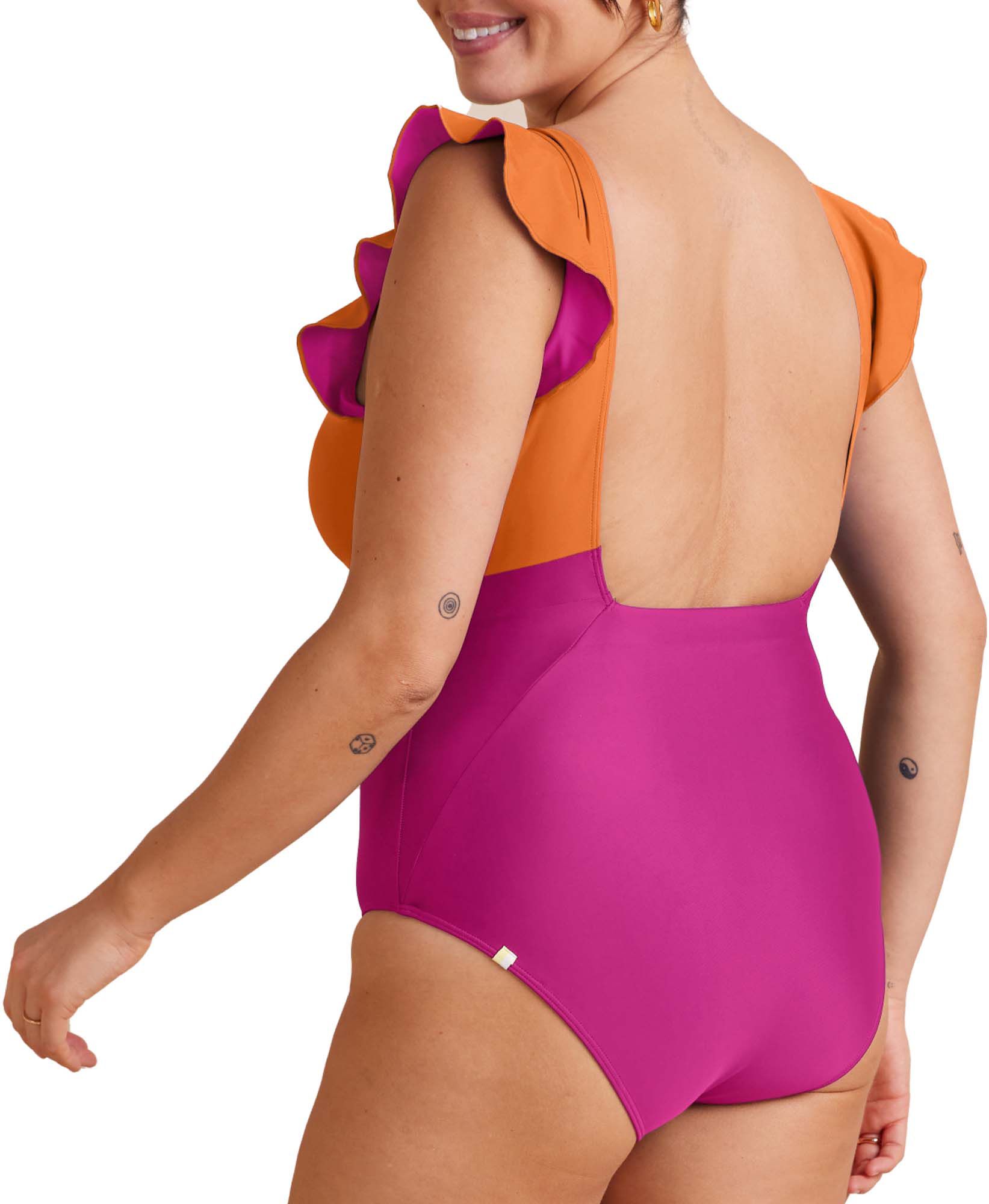 A deep V front, a stunning open back, and flirty ruffles—this suit has it all. Summersalt's signature compression keeps you feeling secure (no tugging or adjusting), and the architectural details make a statement from every angle. Get out there and get ready to turn some heads.