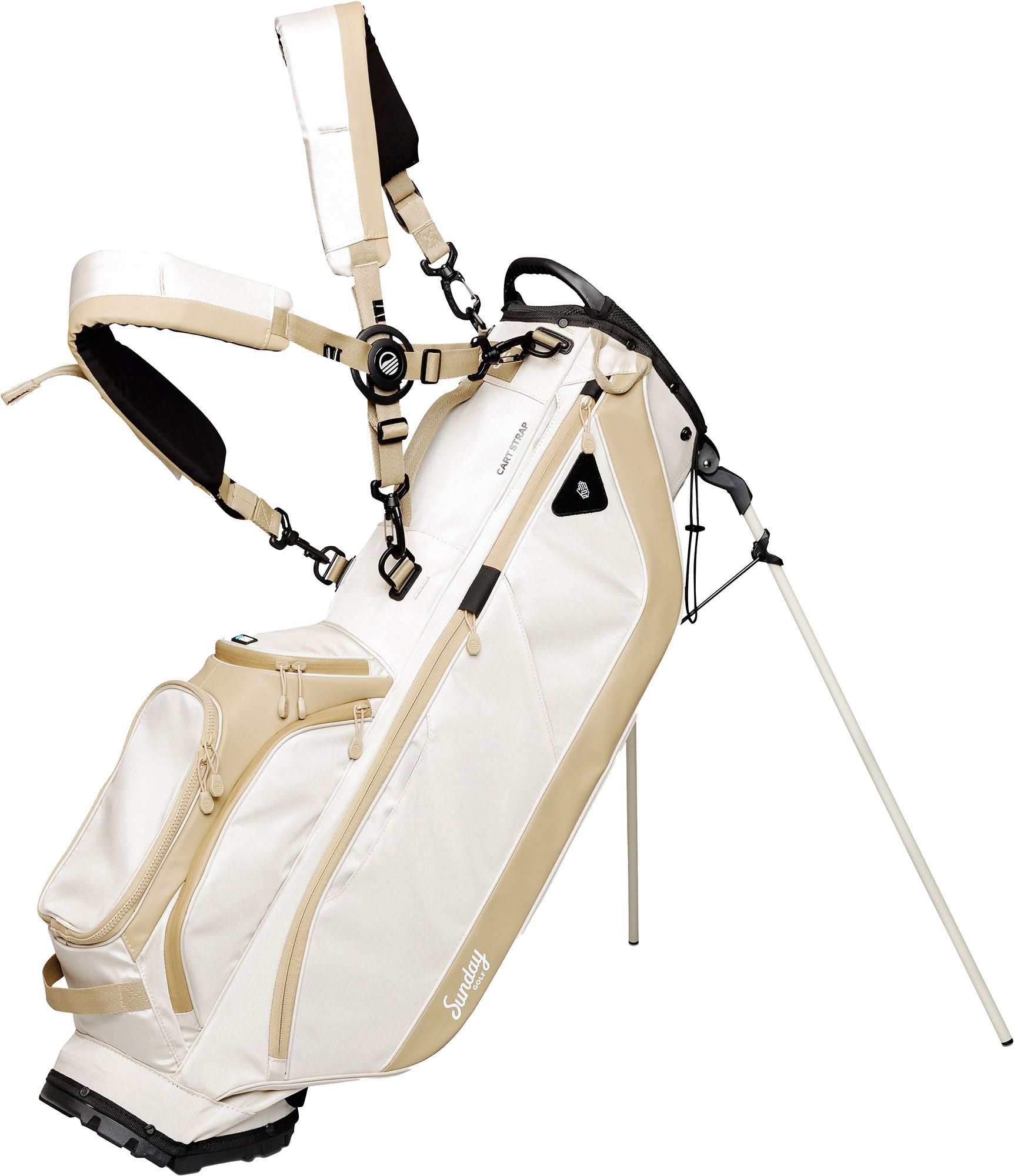 I bought my Sunday Golf Ryder bag in store. I went with the toasted almond colorway. It’s nice to get a bag that doesn’t look like every bag that’s been around for 20 years. It fits my set of 14 clubs just fine. I walk and ride with this bag and it’s a good versatile stand bag. My favorite features are the frosty pocket for my drinks while I’m playing golf. The small “smell proof” pocket is a fun feature and holds all my small items. I like the quick access range finder pocket on the apparel pocket side too.