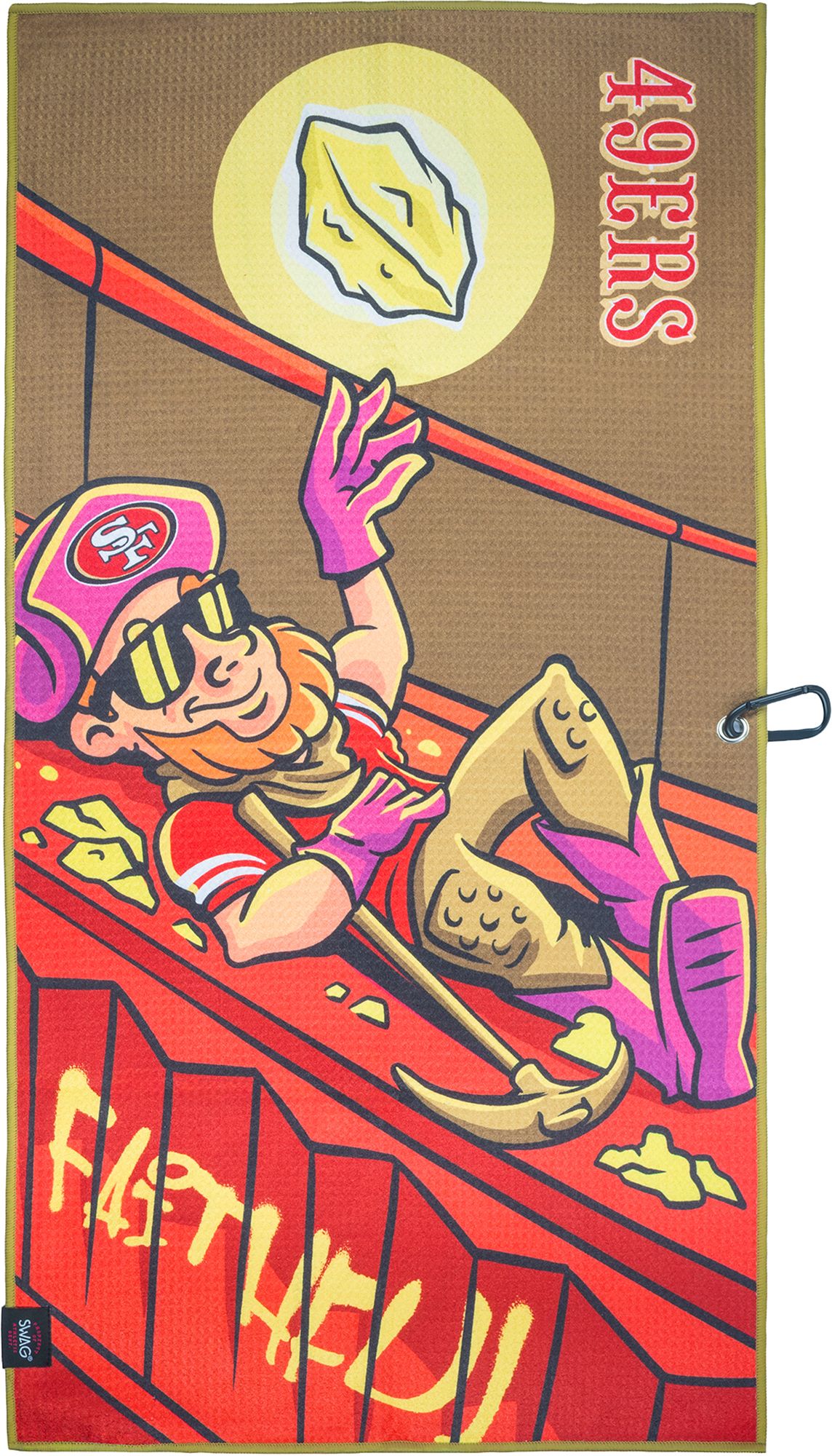 Bring classic 49ers energy to the course. This San Francisco 49ers golf towel features bold artwork inspired by the team’s gold rush legacy, paired with iconic red and gold details. Designed to clip easily to your bag, it is lightweight, durable, and built for every round. Perfect for cleaning clubs, drying hands, and showing off your fandom from tee box to green.