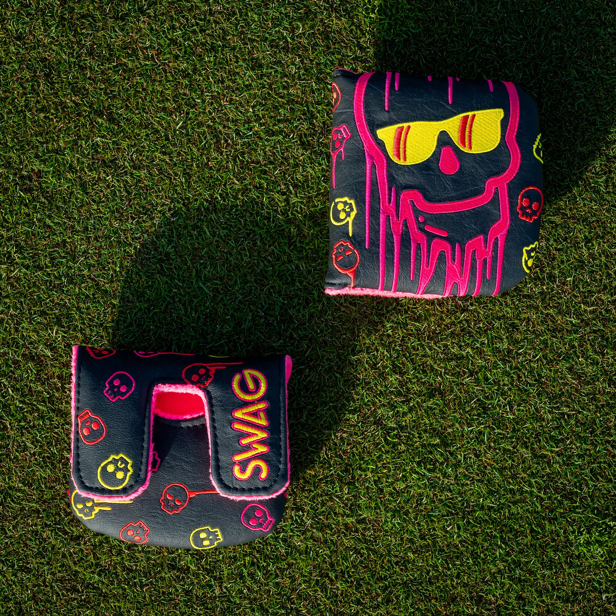 Best in class SWAG Golf Putter headcover designed for center-shafted putters. This cover prominently features a never before seen design to standout from the crowd. All SWAG products use high stitch count designs and premium materials to pair with its bold, original designs