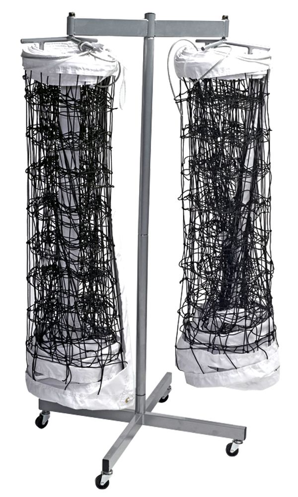 Store two of your volleyball nets quickly and easily with the Tandem ® Double Net Storage Rack. This rack is designed with a unique rotating device that gathers and collects two volleyball nets. The rack is made with a lightweight metal stand with casters for easy movement.