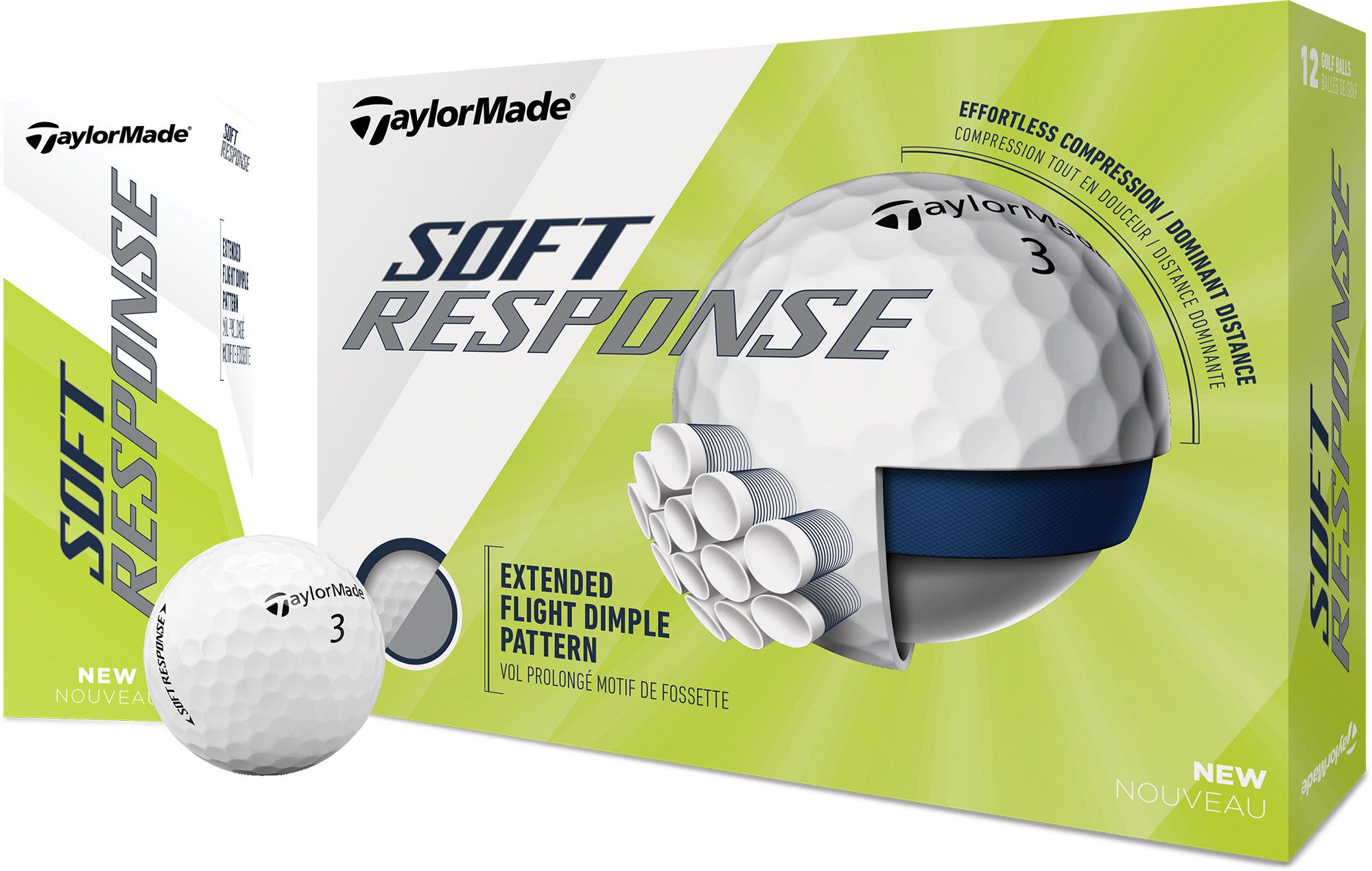 Effortless performance and dominant distance combine to form the TaylorMade Soft Response Golf Balls. Engineered with an extended flight dimple pattern, Soft Response combines increased volume ratio with additional dimple coverage for top-level flight. The Hi-Spring ZnO Flex Core™ delivers optimized ball flight, spin control and feel. A Soft-Tough Ionomer cover provides fast ball speeds and maximum durability.