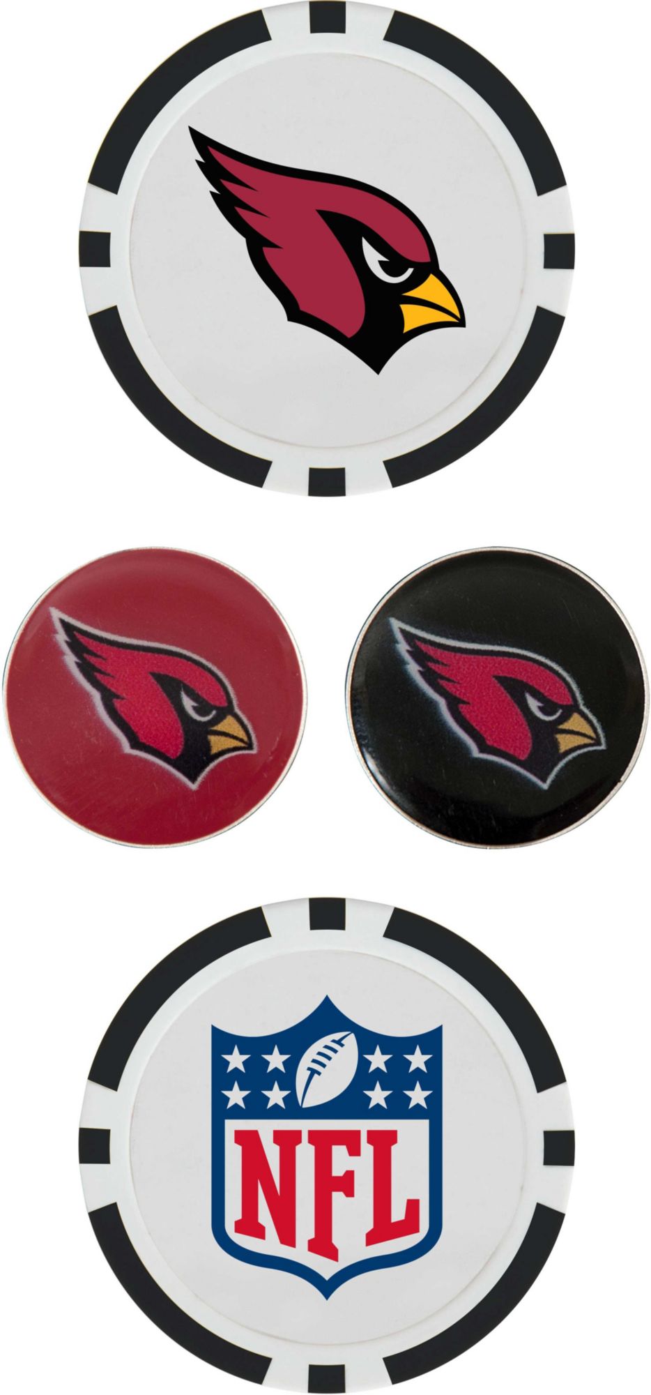 Remind your course mates of your pride in the Cardinals as you prepare for your putt with the Team Effort Arizona Cardinals Ball Marker Set. Two 40mm poker chip style ball markers feature multiple team trademarks and provide an eye-catching take on alignment. Two 25mm iron stamped ball markers feature a full-color team trademark and are suitable for use with most magnetic hat clips for convenience. Leave no doubt about your Cardinals spirit with this unique ball marker set.