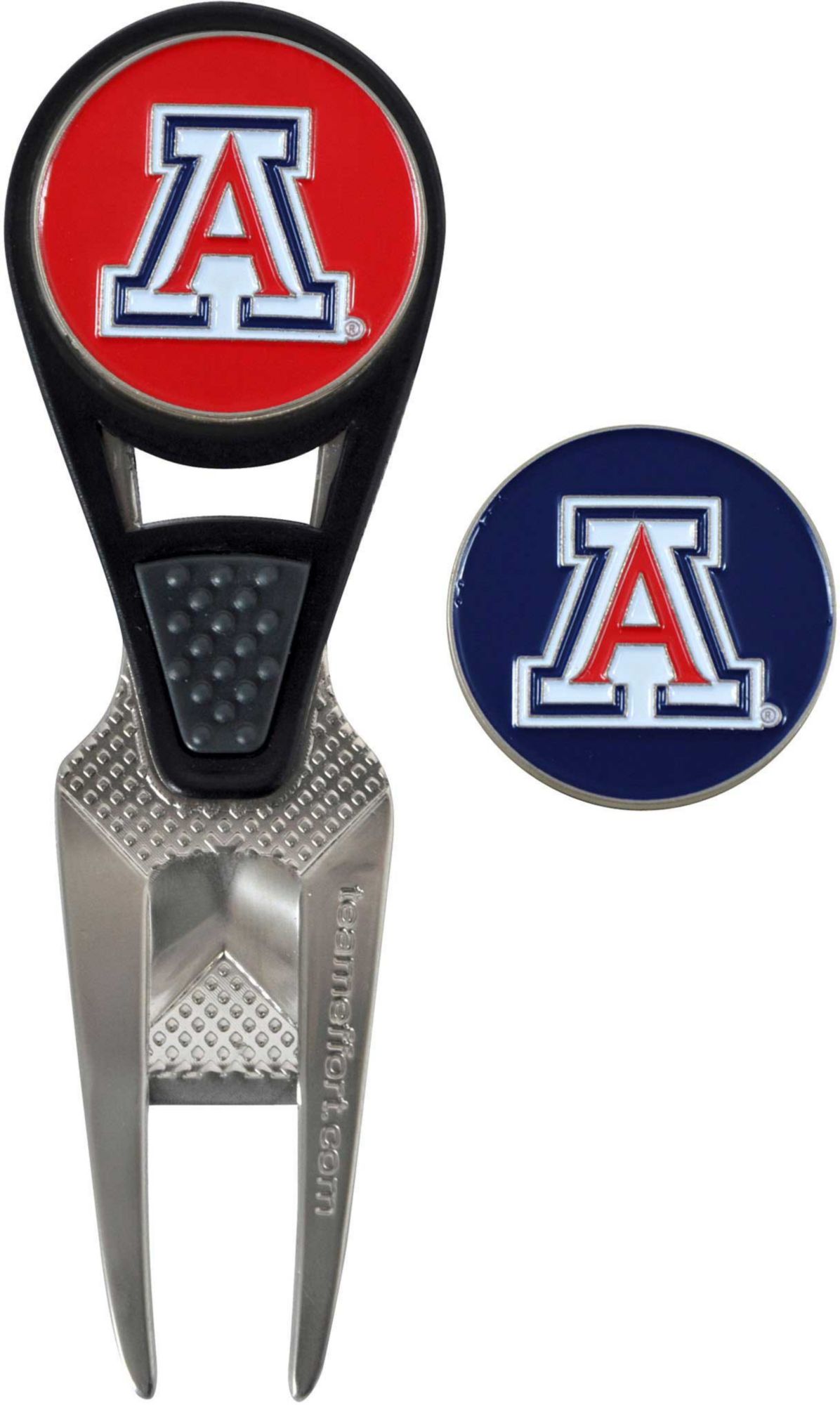 Maintain the green and your sense of Wildcats pride with the Team Effort Arizona Wildcats CVX Divot Tool and Ball Marker Set. The patented CVX tool features an ergonomic construction, custom contoured rails and a textured thumb indent for maximum comfort during use. Two 25mm, iron stamped ball markers feature team trademarks and sit within the magnetic housing on the front of the tool for at hand convenience. Leave no doubt as to your support for the Wildcats with this officially licensed divot tool.