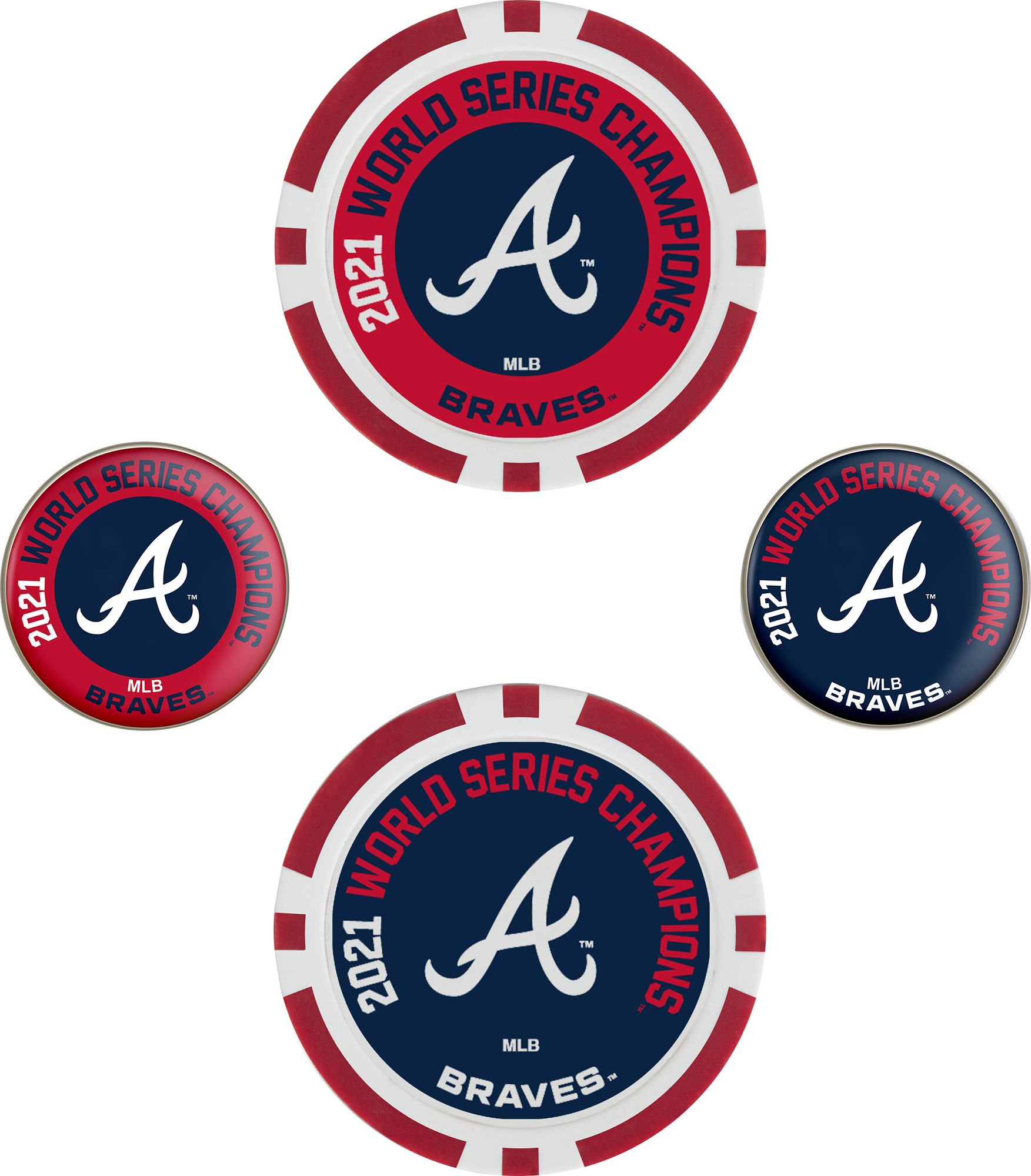 Celebrate the Atlanta Braves 2021 World Series Championship victory with the Team Effort Ball Market Set. Remind your course mates of your team pride as you prepare for your putt with the Team Effort Team Branded Ball Marker Set. Two 40mm poker chip style ball markers feature multiple team trademarks and provide an eye-catching take on alignment. Two 25mm iron stamped ball markers feature a full-color 2021 World Series Champion Atlanta Braves trademark and are suitable for use with most magnetic hat clips for convenience. Leave no doubt about your team spirit with this unique ball marker set.