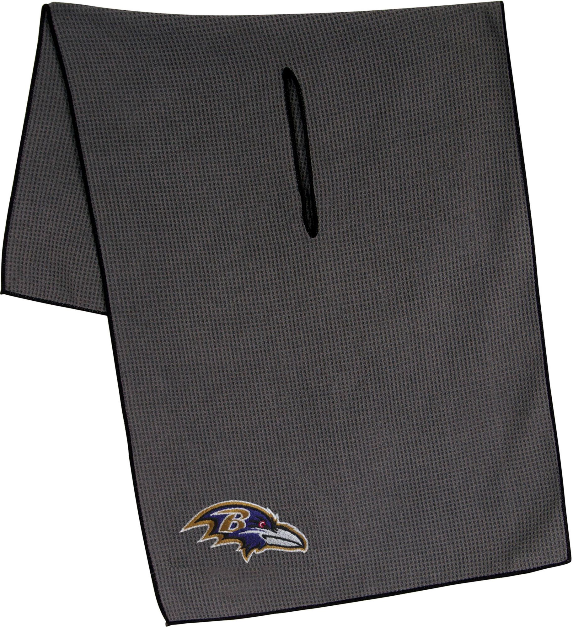 Maintain your clubs as easily as the Ravens maintain a lead while using the Team Effort Baltimore Ravens Microfiber Golf Towel. The microfiber waffle-weave construction enables fast and easy club cleaning without damaging the finish. An oversized construction allows you to keep part of the towel wet and part dry for easier cleaning, while a large center slit slides over your clubs for added protection. A boldly embroidered team trademark puts your Ravens pride on full display.