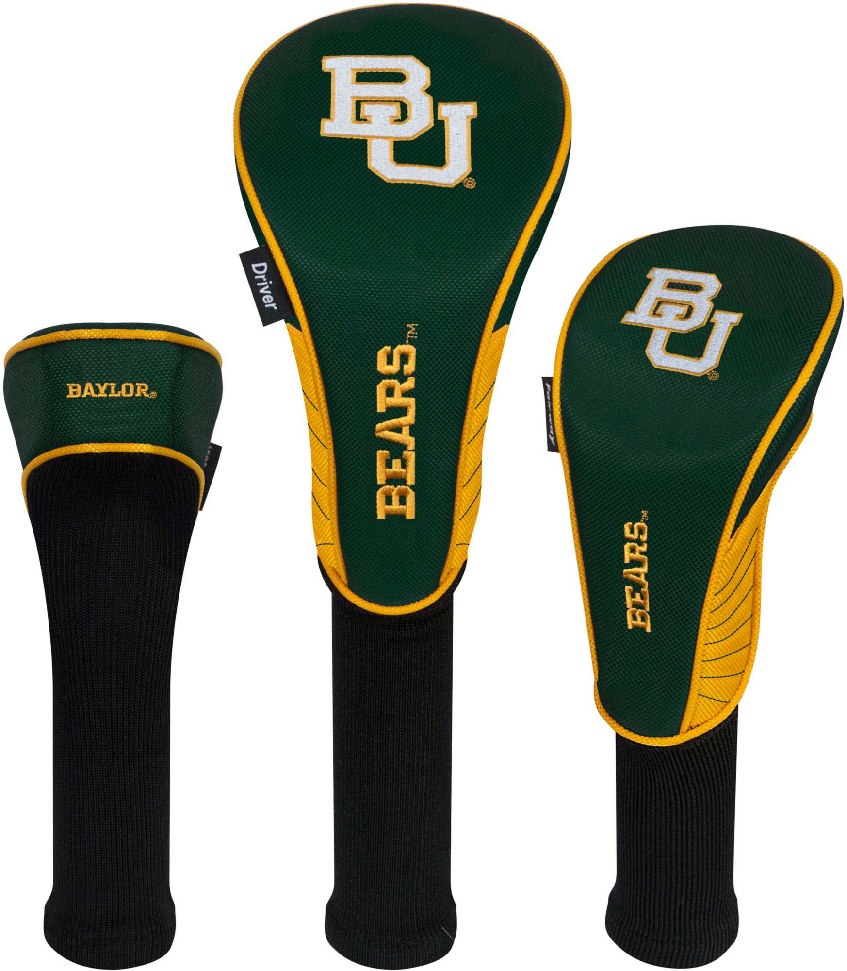 Boldly display your support for the Bears by protecting your metalwoods with Team Effort Baylor Bears Headcovers. Specifically designed to fit most driver, fairway wood and hybrid models, each premium headcover is constructed of rugged 420D nylon material and features a long neck design to deliver maximum club protection. Vibrant, contrasting team color elements combine with multiple team trademark embroideries to show your course mates who back on game day.