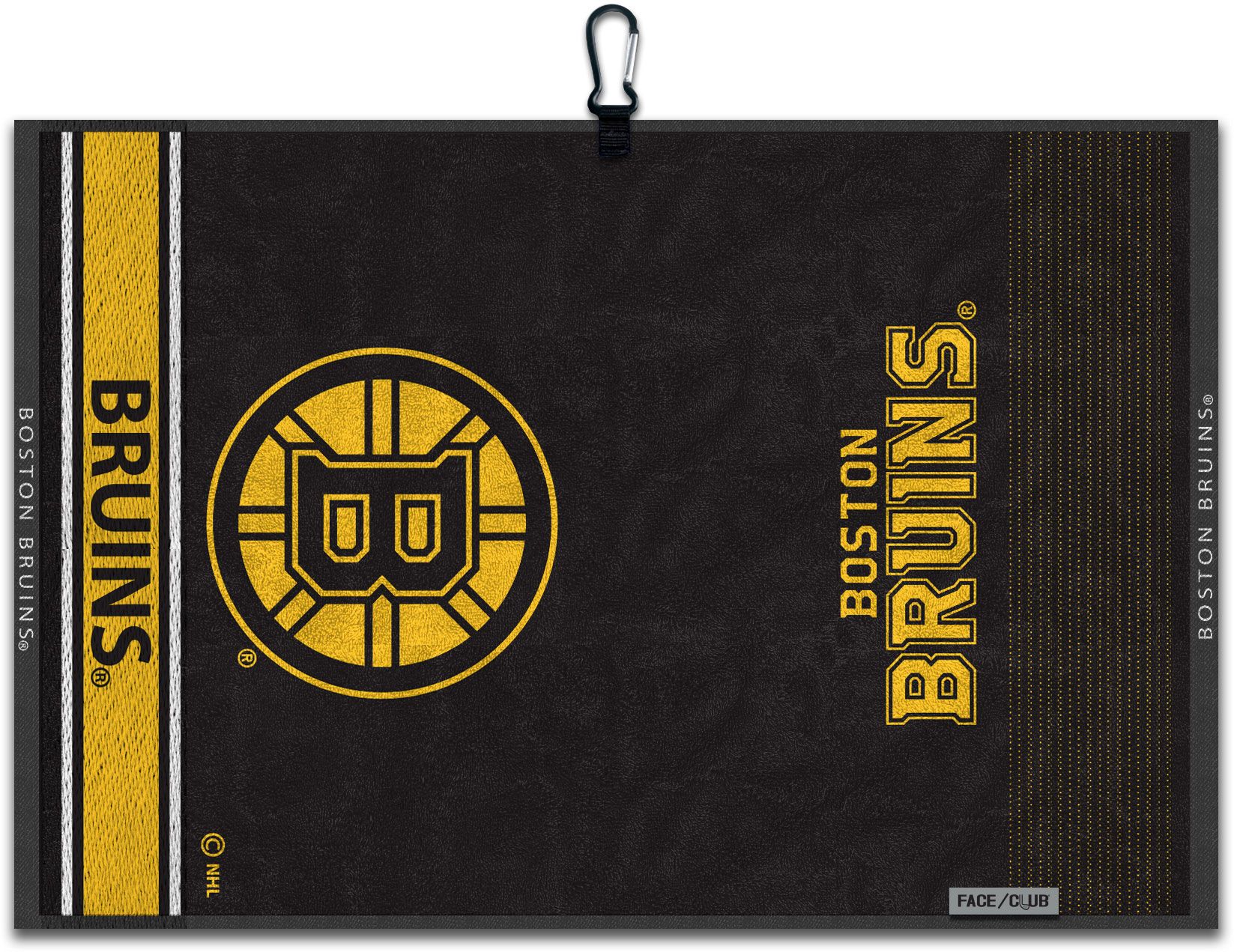 Ingenuity meets versatility to form the Team Effort Boston Bruins Embroidered Face/Club Tri-Fold Golf Towel. This dual-textured towel features woven ribs designed to remove dirt from your clubs and a highly absorbent, sheared velour panel to wick away moisture. A carabineer clip located on top secures the towel to your bag or cart for maximum convenience. A boldly embroidered, full-color team trademark shows everyone on the course your support for your favorite team.