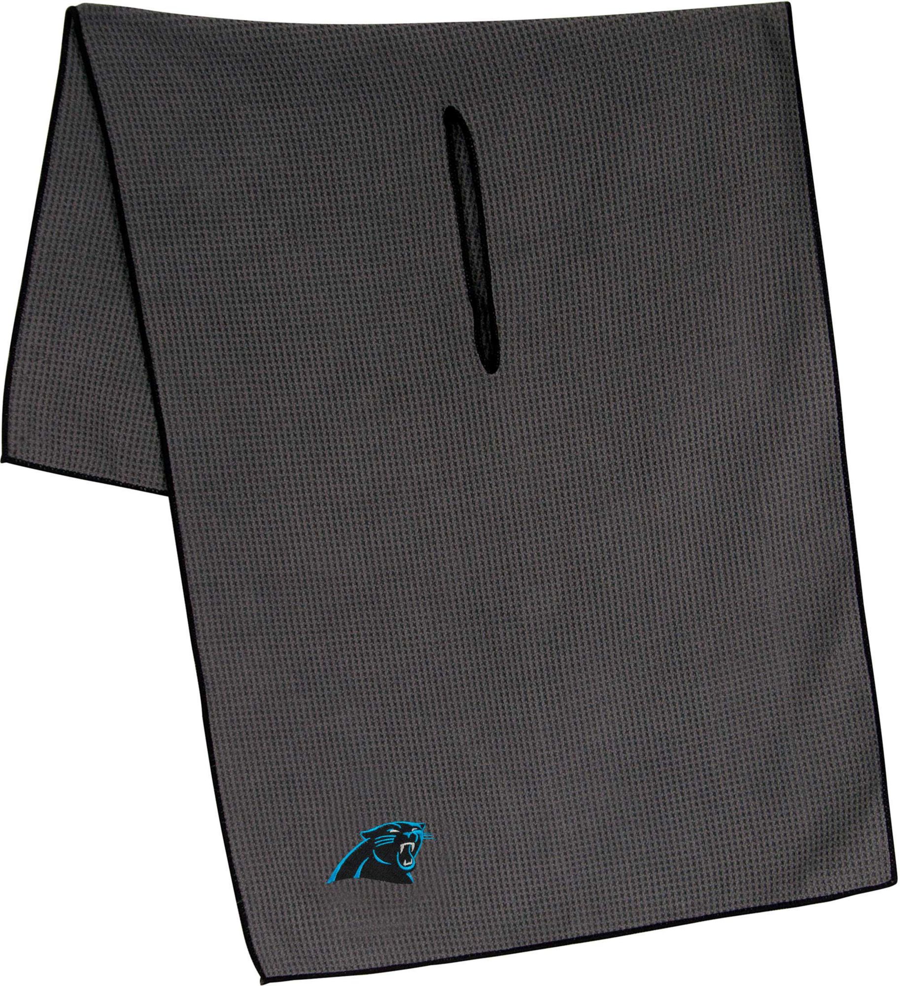 Maintain your clubs as easily as the Panthers maintain a lead while using the Team Effort Carolina Panthers Microfiber Golf Towel. The microfiber waffle-weave construction enables fast and easy club cleaning without damaging the finish. An oversized construction allows you to keep part of the towel wet and part dry for easier cleaning, while a large center slit slides over your clubs for added protection. A boldly embroidered team trademark puts your Panthers pride on full display.
