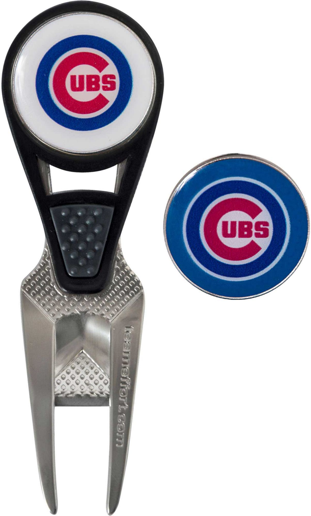 Maintain the green and your sense of Cubs pride with the Team Effort Chicago Cubs CVX Divot Tool and Ball Marker Set. The patented CVX tool features an ergonomic construction, custom contoured rails and a textured thumb indent for maximum comfort during use. Two 25mm, iron stamped ball markers feature team trademarks and sit within the magnetic housing on the front of the tool for at hand convenience. Leave no doubt as to your support for the Cubs with this officially licensed divot tool.