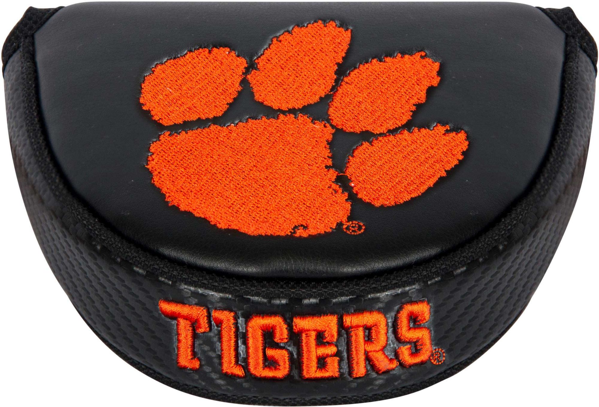Incorporate Tigers spirit into your pre-putt routine with the Team Effort Clemson Tigers Mallet Putter Headcover. Specifically tailored to fit most mallet-style putter models, this premium headcover is constructed of soft-touch, water-resistant exterior material and soft fleece lining to enable complete protection during your round. A hook-and-loop closure system secures the headcover to your putter while allowing for easy on/off. Multiple team trademark embroideries create a style that brings pride to every Tigers fan.