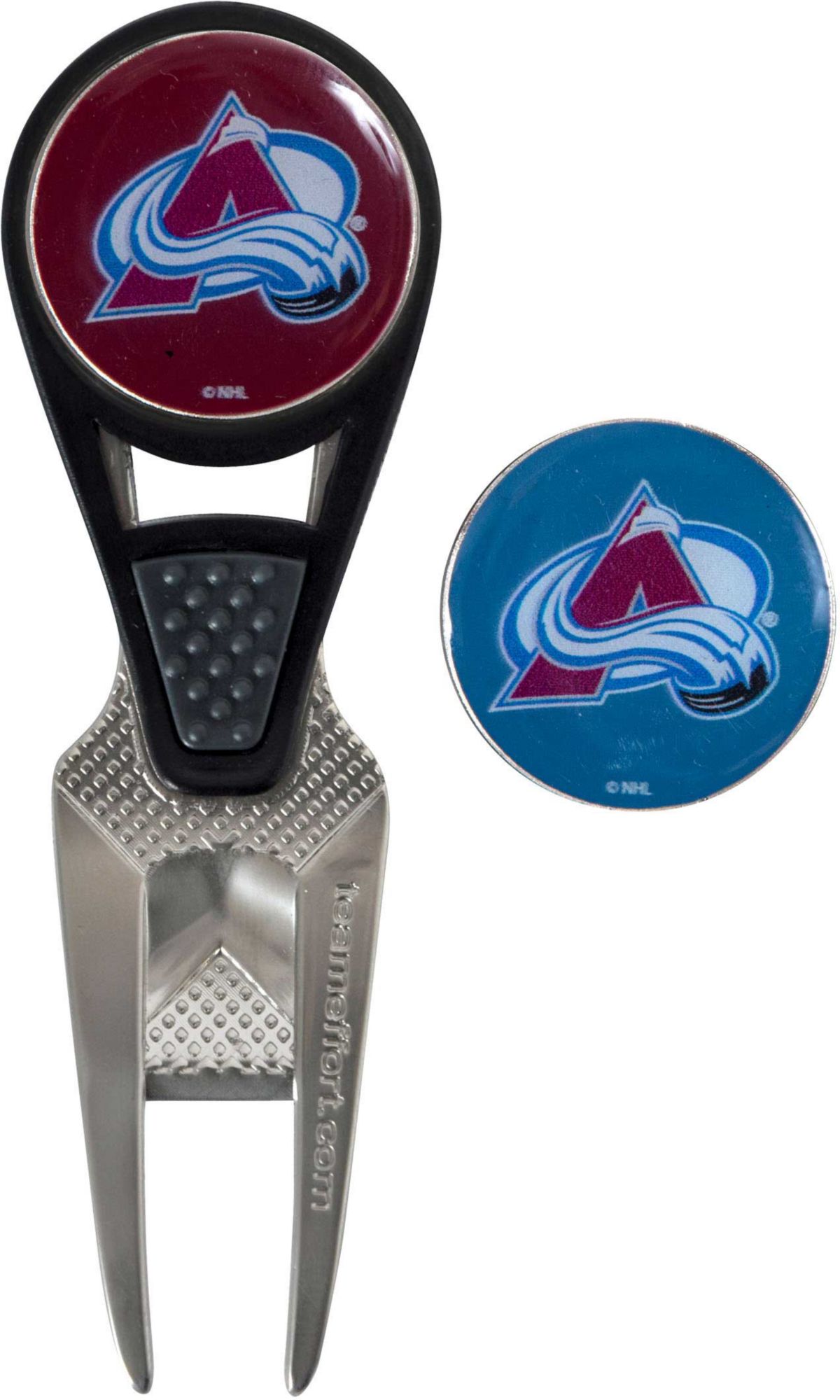 Maintain the green and your sense of Avalanche pride with the Team Effort Colorado Avalanche CVX Divot Tool and Ball Marker Set. The patented CVX tool features an ergonomic construction, custom contoured rails and a textured thumb indent for maximum comfort during use. Two 25mm, iron stamped ball markers feature team trademarks and sit within the magnetic housing on the front of the tool for at hand convenience. Leave no doubt as to your support for the Avalanche with this officially licensed divot tool.