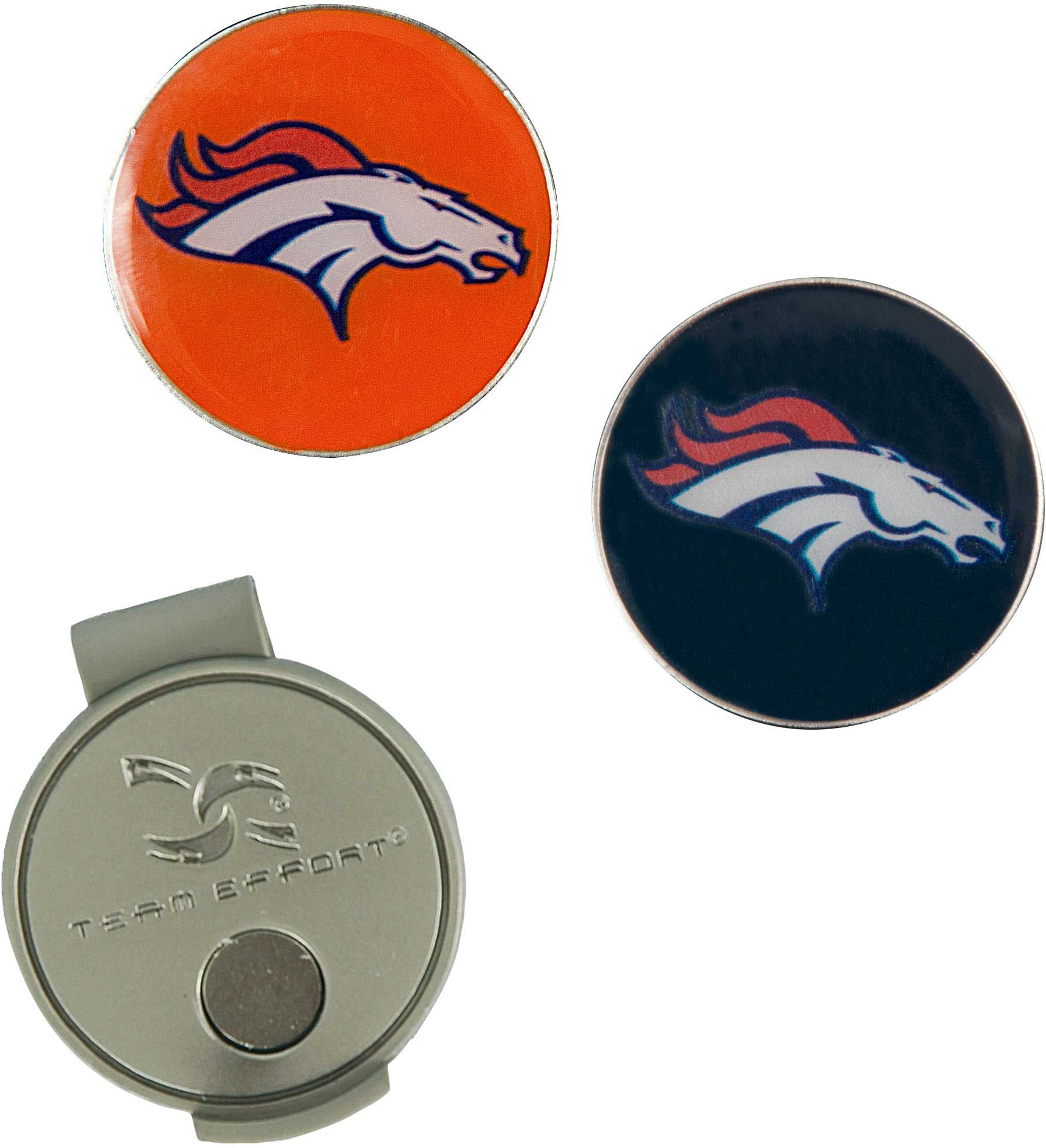 Show Broncos loyalty during your pre-putt routine with the Team Effort Denver Broncos Hat Clip and Ball Markers Set. Designed to securely fix to the brim of most caps and visors, the cap clip features a nickel finish for long-lasting durability. Two interchangeable, iron-stamped ball markers feature full-color team trademarks designed to add a touch of Broncos flair to your look. After your putt, the magnetic markers easily attach to the cap clip for hassle-free use.