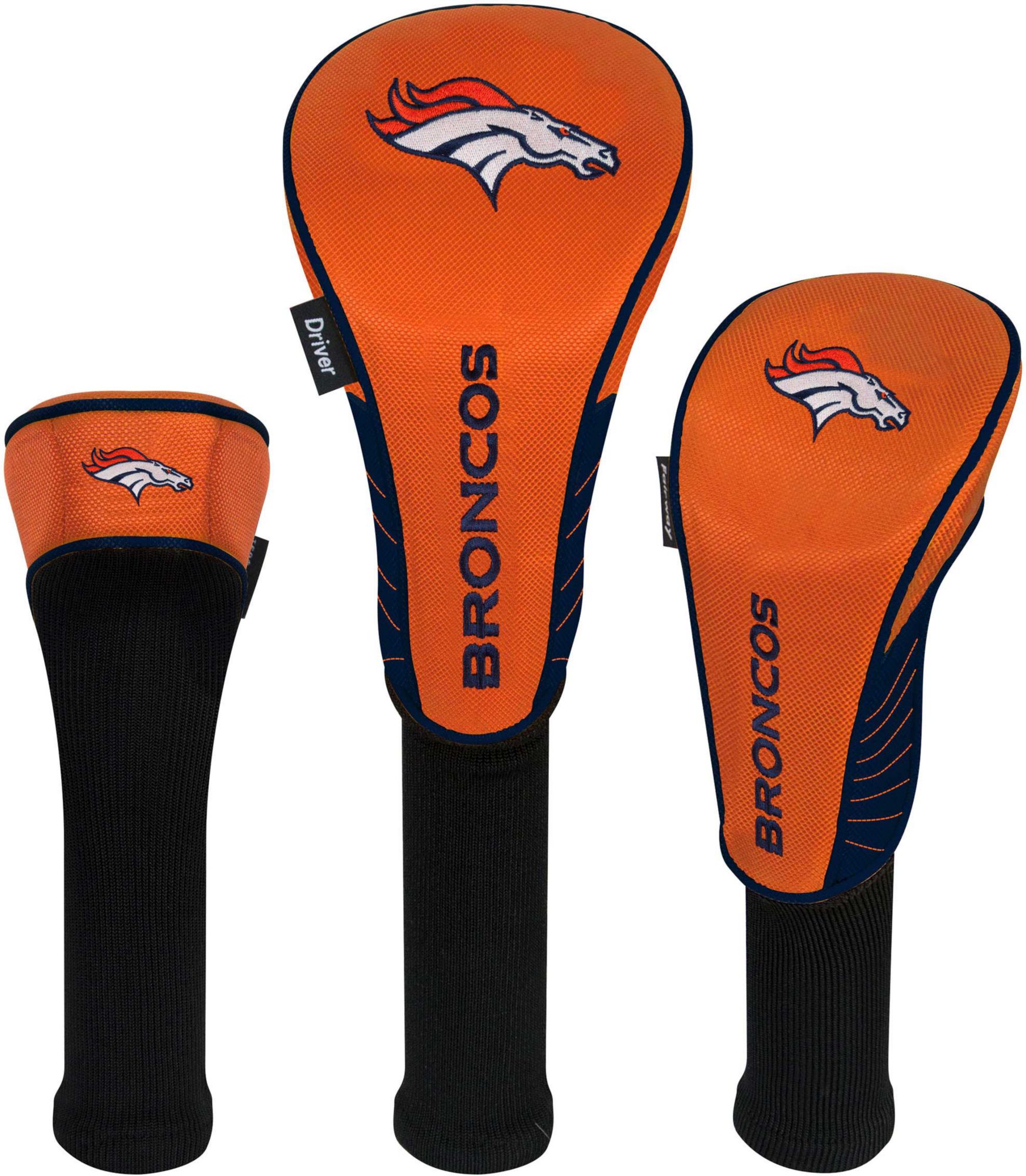 Boldly display your support for the Broncos by protecting your metalwoods with Team Effort Denver Broncos Headcovers. Specifically designed to fit most driver, fairway wood and hybrid models, each premium headcover is constructed of rugged 420D nylon material and features a long neck design to deliver maximum club protection. Vibrant, contrasting team color elements combine with multiple team trademark embroideries to show your course mates who back on game day.