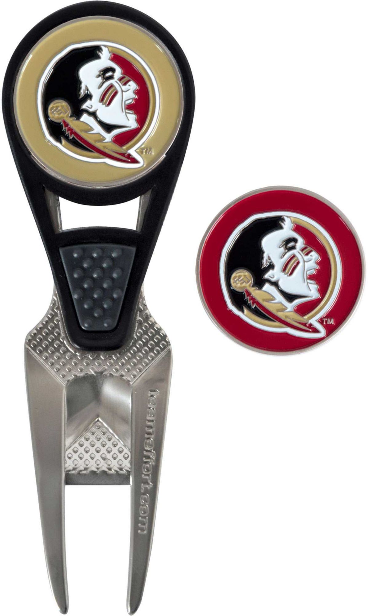 Maintain the green and your sense of Seminoles pride with the Team Effort Florida State Seminoles CVX Divot Tool and Ball Marker Set. The patented CVX tool features an ergonomic construction, custom contoured rails and a textured thumb indent for maximum comfort during use. Two 25mm, iron stamped ball markers feature team trademarks and sit within the magnetic housing on the front of the tool for at hand convenience. Leave no doubt as to your support for the Seminoles with this officially licensed divot tool.