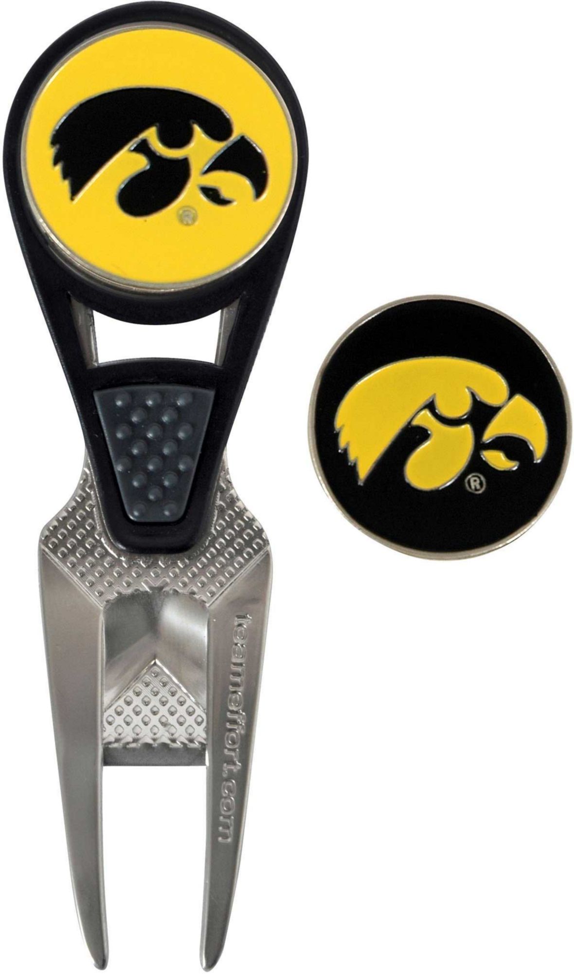 Maintain the green and your sense of Hawkeyes pride with the Team Effort Iowa Hawkeyes CVX Divot Tool and Ball Marker Set. The patented CVX tool features an ergonomic construction, custom contoured rails and a textured thumb indent for maximum comfort during use. Two 25mm, iron stamped ball markers feature team trademarks and sit within the magnetic housing on the front of the tool for at hand convenience. Leave no doubt as to your support for the Hawkeyes with this officially licensed divot tool.