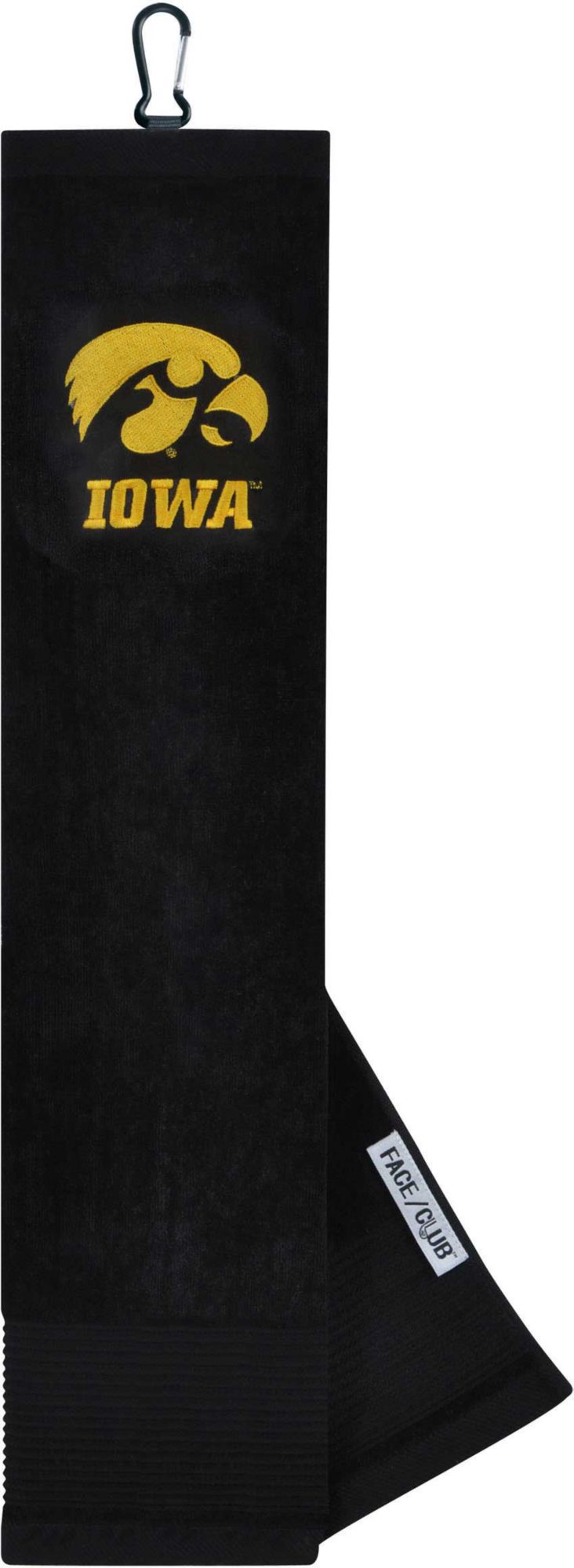 Ingenuity meets versatility to form the Team Effort Iowa Hawkeyes Embroidered Face/Club Tri-Fold Towel. This dual-textured towel features woven ribs designed to remove dirt from your clubs and a highly absorbent, sheared velour panel to wick away moisture. A carabineer clip located on top secures the towel to your bag or cart for maximum convenience. A boldly embroidered, full-color team trademark shows everyone on the course your support for the Hawkeyes .