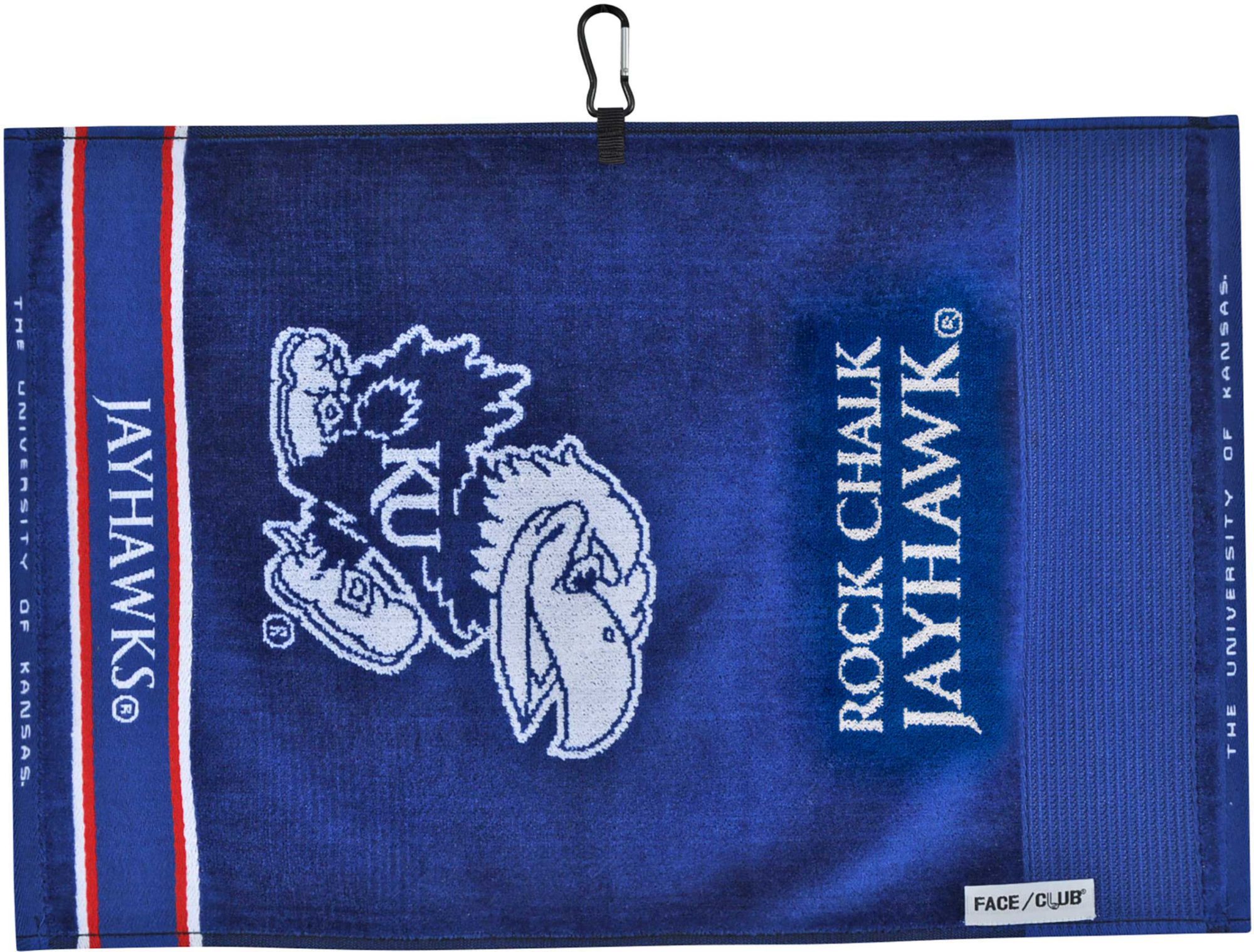Let your pride in the Jayhawks show through on the course while using the Team Effort Kansas Jayhawks Face/Club Jacquard Golf Towel. Designed to be both absorbent and soft to the touch, this dual-textured golf towel features woven ribs designed to remove dirt from your clubs and a highly absorbent, sheared velour panel to wick away moisture. A carabineer clip located on top secures the towel to your bag or cart for maximum convenience. Eye catching team colors and woven trademarks create an unmistakable Jayhawks look.
