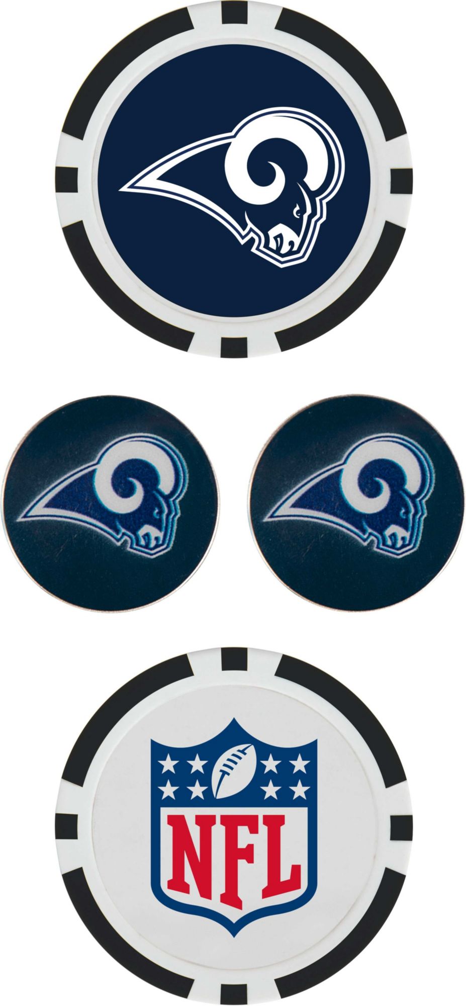 Remind your course mates of your pride in the Rams as you prepare for your putt with the Team Effort Los Angeles Rams Ball Marker Set. Two 40mm poker chip style ball markers feature multiple team trademarks and provide an eye-catching take on alignment. Two 25mm iron stamped ball markers feature a full-color team trademark and are suitable for use with most magnetic hat clips for convenience. Leave no doubt about your Rams spirit with this unique ball marker set.