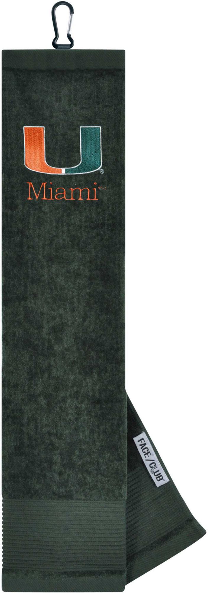 Ingenuity meets versatility to form the Team Effort Miami Hurricanes Embroidered Face/Club Tri-Fold Towel. This dual-textured towel features woven ribs designed to remove dirt from your clubs and a highly absorbent, sheared velour panel to wick away moisture. A carabineer clip located on top secures the towel to your bag or cart for maximum convenience. A boldly embroidered, full-color team trademark shows everyone on the course your support for the Hurricanes .