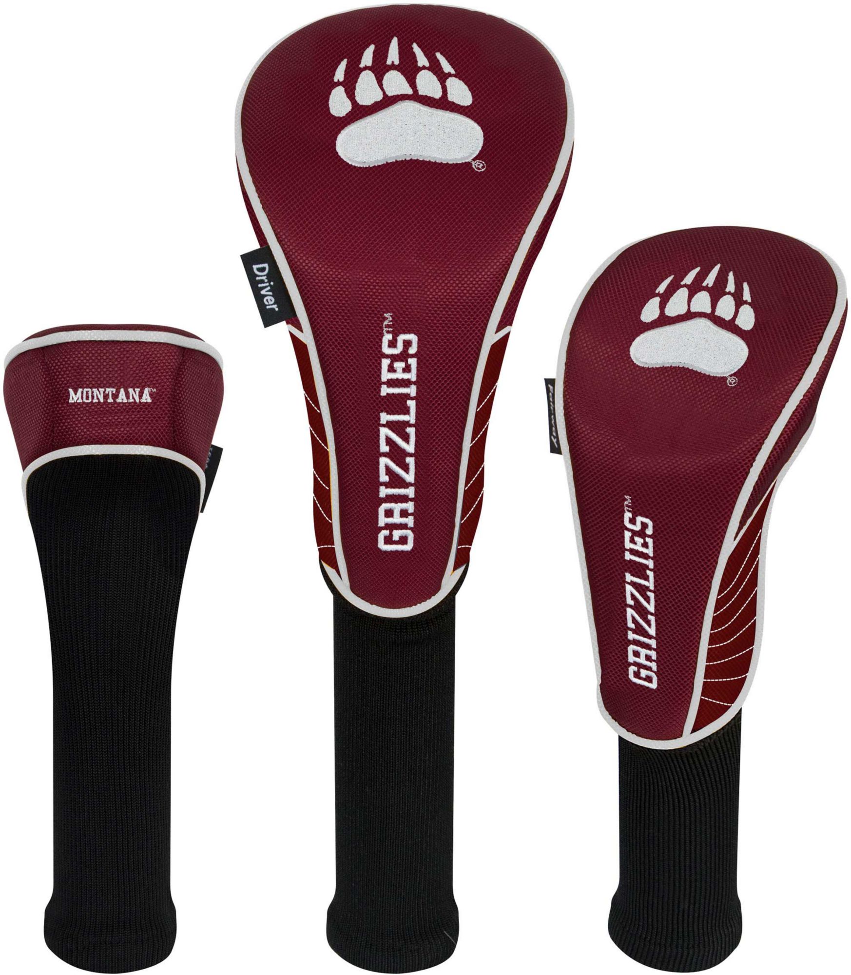 Boldly display your support for the Grizzlies by protecting your metalwoods with Team Effort Montana Grizzlies Headcovers. Specifically designed to fit most driver, fairway wood and hybrid models, each premium headcover is constructed of rugged 420D nylon material and features a long neck design to deliver maximum club protection. Vibrant, contrasting team color elements combine with multiple team trademark embroideries to show your course mates who back on game day.