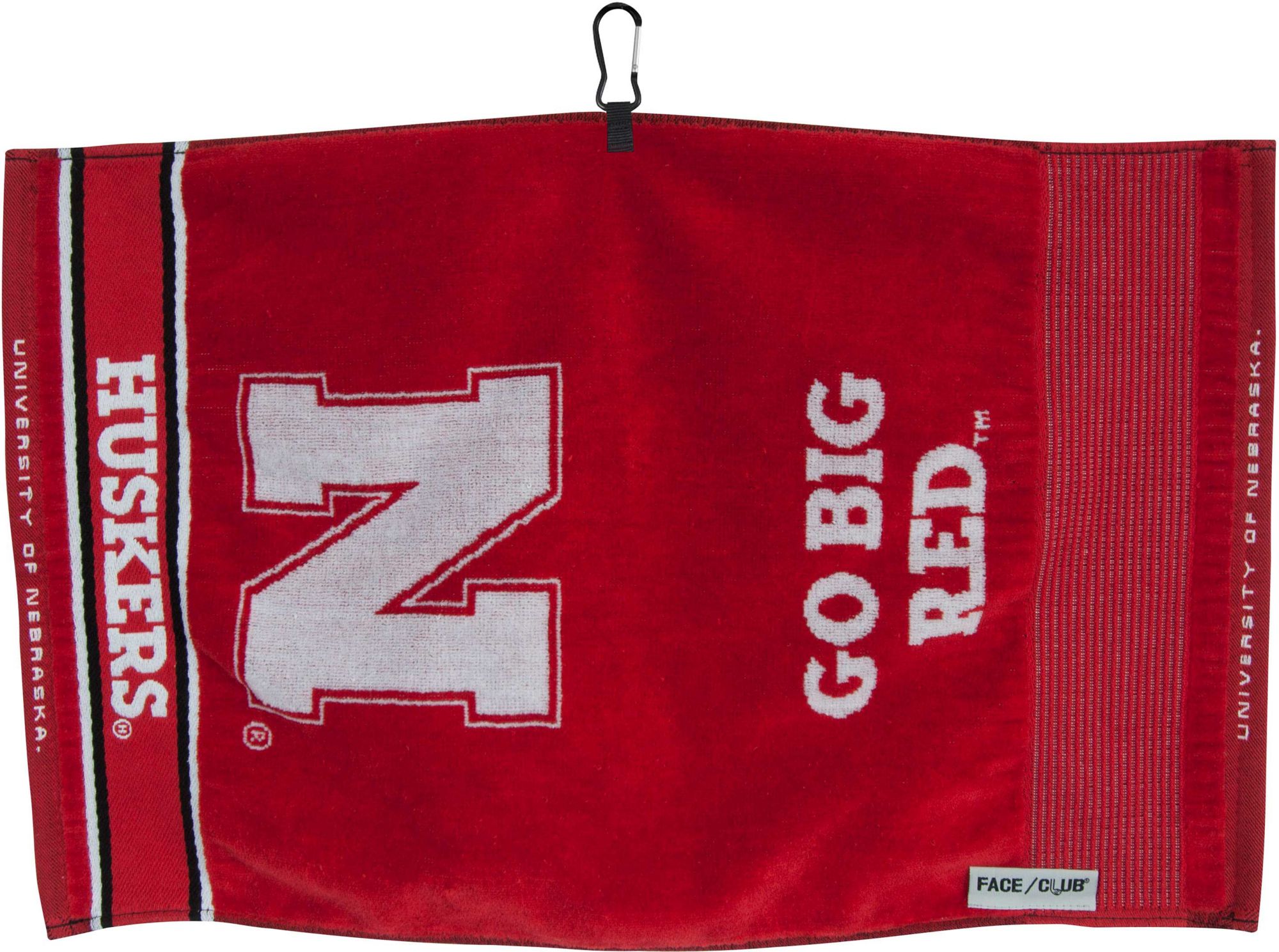 Let your pride in the Cornhuskers show through on the course while using the Team Effort Nebraska Cornhuskers Face/Club Jacquard Golf Towel. Designed to be both absorbent and soft to the touch, this dual-textured golf towel features woven ribs designed to remove dirt from your clubs and a highly absorbent, sheared velour panel to wick away moisture. A carabineer clip located on top secures the towel to your bag or cart for maximum convenience. Eye catching team colors and woven trademarks create an unmistakable Cornhuskers look.
