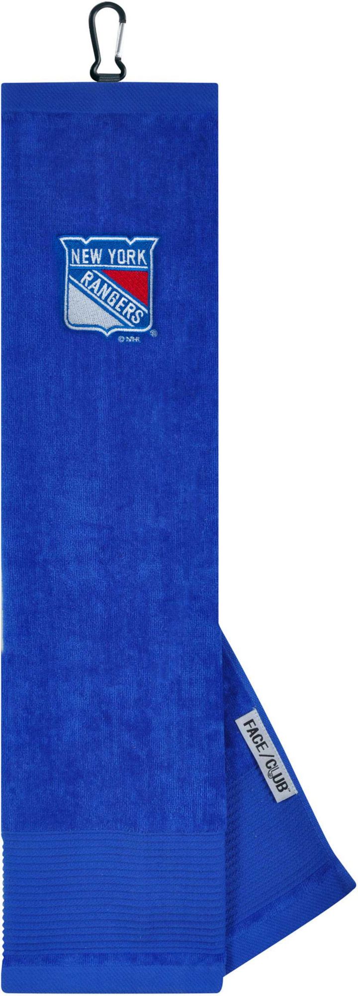 Ingenuity meets versatility to form the Team Effort New York Rangers Embroidered Face/Club Tri-Fold Towel. This dual-textured towel features woven ribs designed to remove dirt from your clubs and a highly absorbent, sheared velour panel to wick away moisture. A carabineer clip located on top secures the towel to your bag or cart for maximum convenience. A boldly embroidered, full-color team trademark shows everyone on the course your support for the Rangers .
