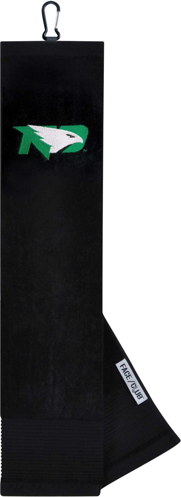 Ingenuity meets versatility to form the Team Effort North Dakota Fighting Hawks Embroidered Face/Club Tri-Fold Towel. This dual-textured towel features woven ribs designed to remove dirt from your clubs and a highly absorbent, sheared velour panel to wick away moisture. A carabineer clip located on top secures the towel to your bag or cart for maximum convenience. A boldly embroidered, full-color team trademark shows everyone on the course your support for the Fighting Hawks .