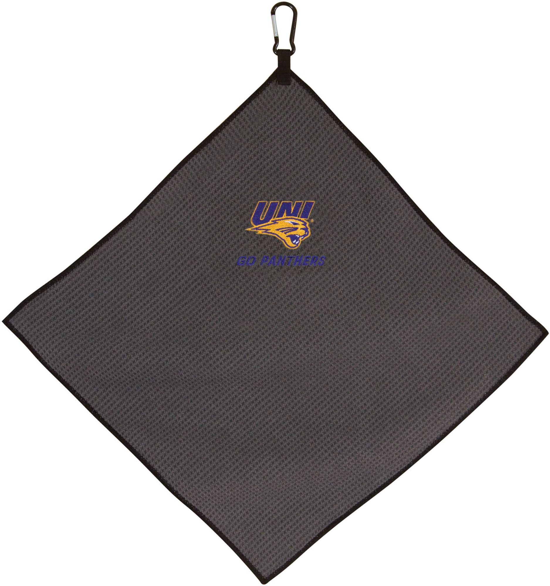 Keep your clubs in top condition while showing Panthers pride with the Team Effort Northern Iowa Panthers Microfiber Golf Towel. The microfiber waffle-weave construction enables fast and easy club cleaning without damaging your club’s finish. A rugged carabineer clip located at the top allows you to secure the towel to your bag or cart for easy access as you prepare for your next shot. A boldly embroidered team trademark puts your Panthers spirit on full display.
