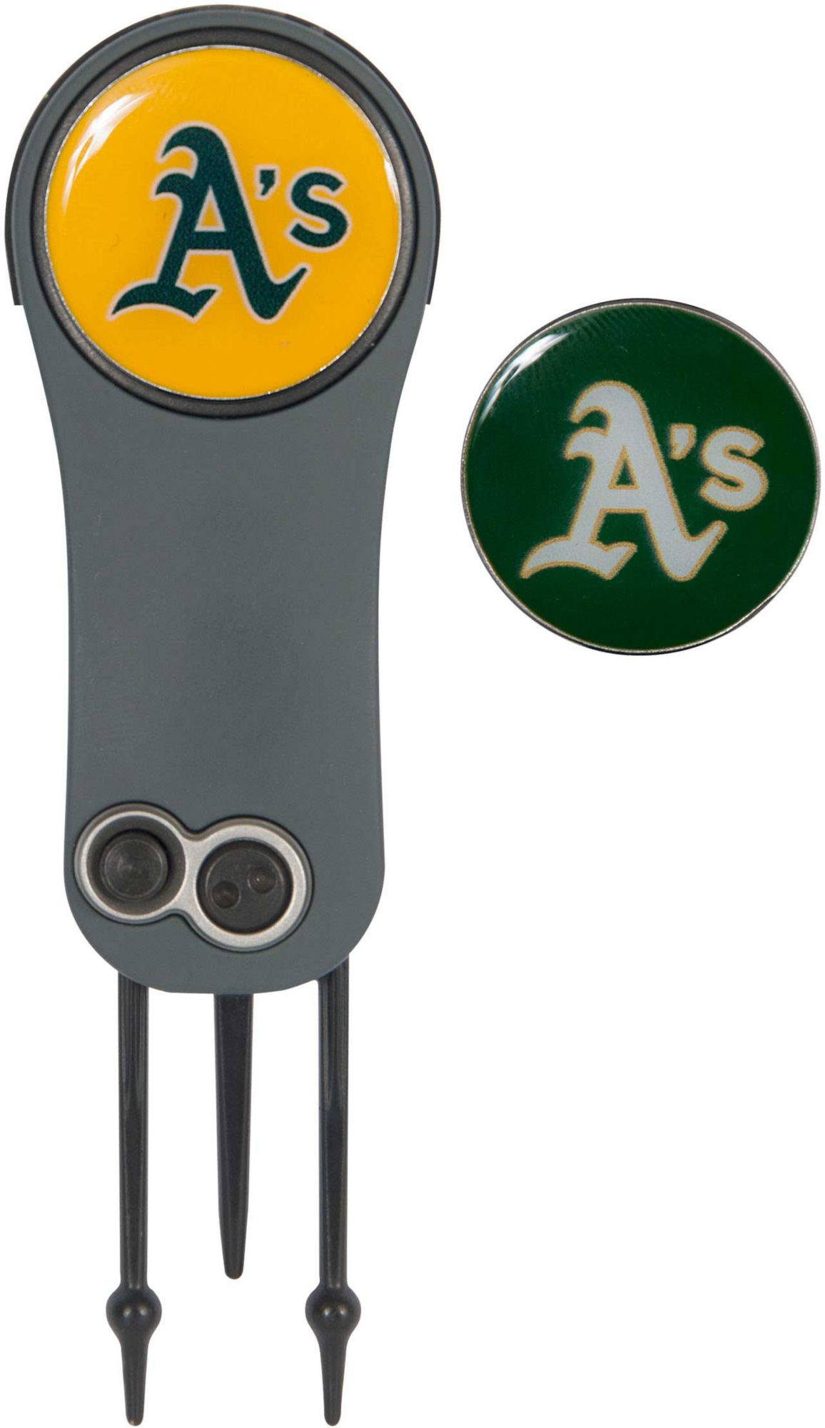 Turn heads with your skill and course etiquette while using the Team Effort Oakland Athletics Switchblade Divot Tool. This ergonomically crafted divot tool features a switchblade prong engagement mechanism and utilizes Fusion Pin technology to make repairing divots fast and easy. Two 25mm, iron stamped ball markers feature team trademarks and sit within the magnetic housing on the front of the tool for at hand convenience. An integrated pencil sharpener provides championship-level versatility.