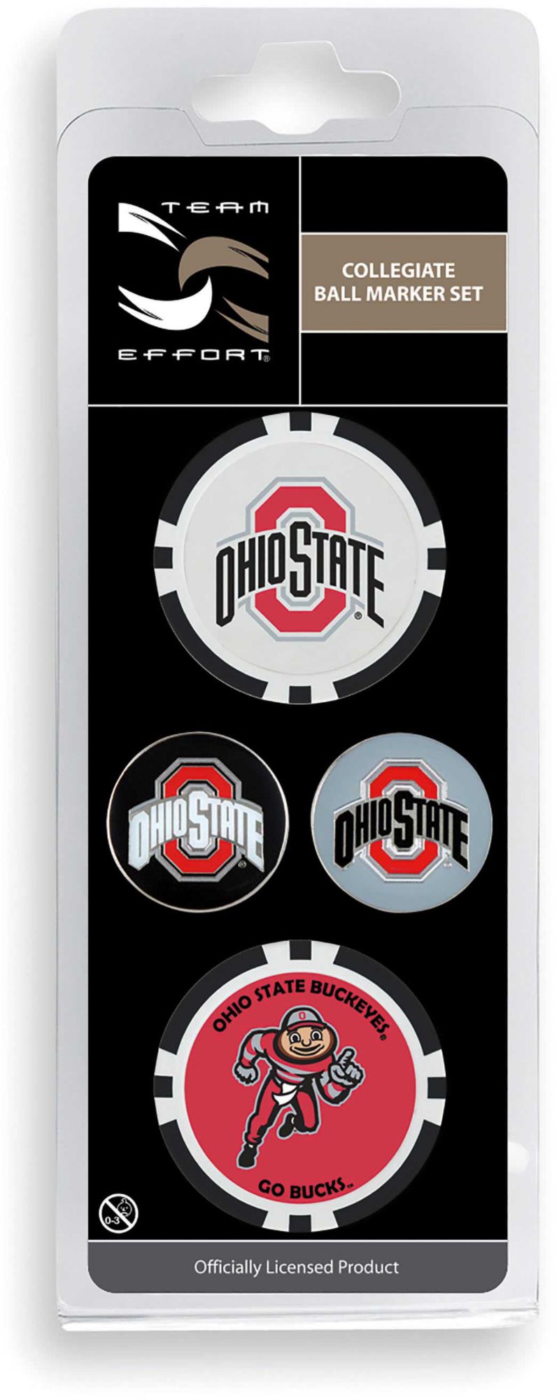 Remind your course mates of your pride in the Buckeyes as you prepare for your putt with the Team Effort Ohio State Buckeyes Ball Marker Set. Two 40mm poker chip style ball markers feature multiple team trademarks and provide an eye-catching take on alignment. Two 25mm iron stamped ball markers feature a full-color team trademark and are suitable for use with most magnetic hat clips for convenience. Leave no doubt about your Buckeyes spirit with this unique ball marker set.