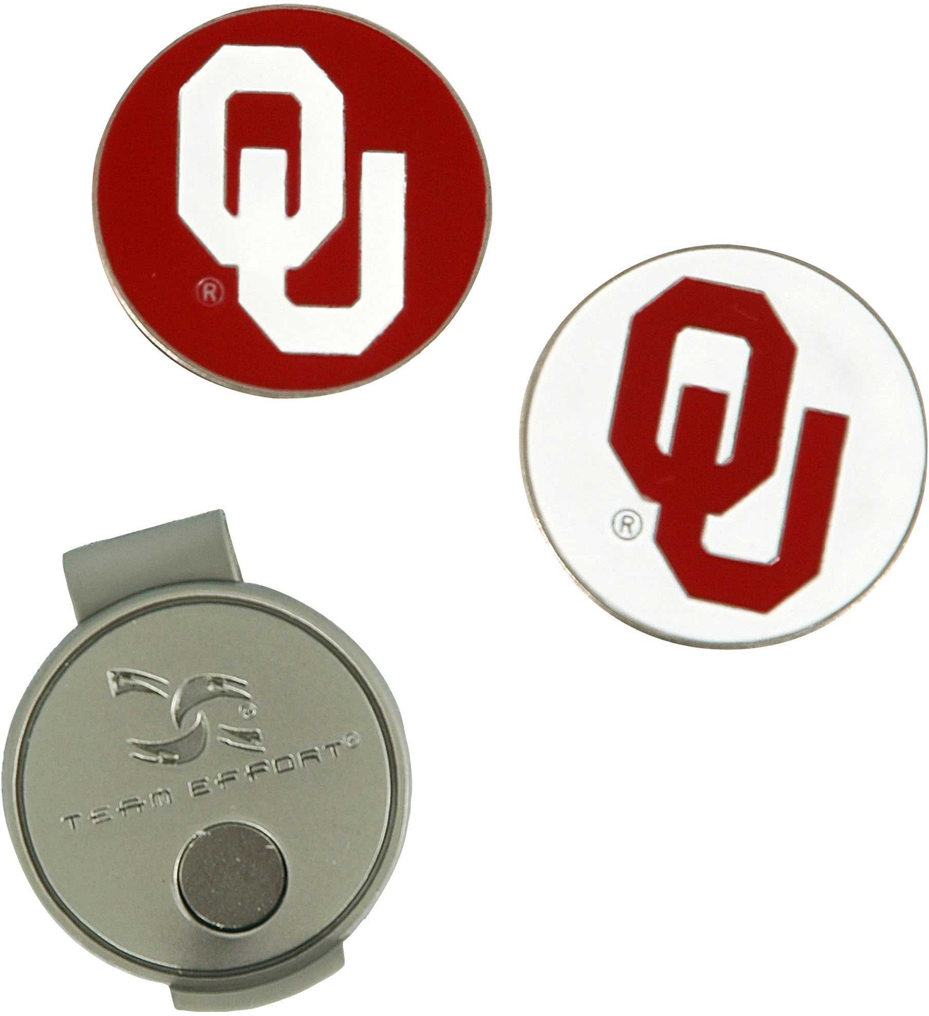 Show Sooners loyalty during your pre-putt routine with the Team Effort Oklahoma Sooners Hat Clip and Ball Markers Set. Designed to securely fix to the brim of most caps and visors, the cap clip features a nickel finish for long-lasting durability. Two interchangeable, iron-stamped ball markers feature full-color team trademarks designed to add a touch of Sooners flair to your look. After your putt, the magnetic markers easily attach to the cap clip for hassle-free use.