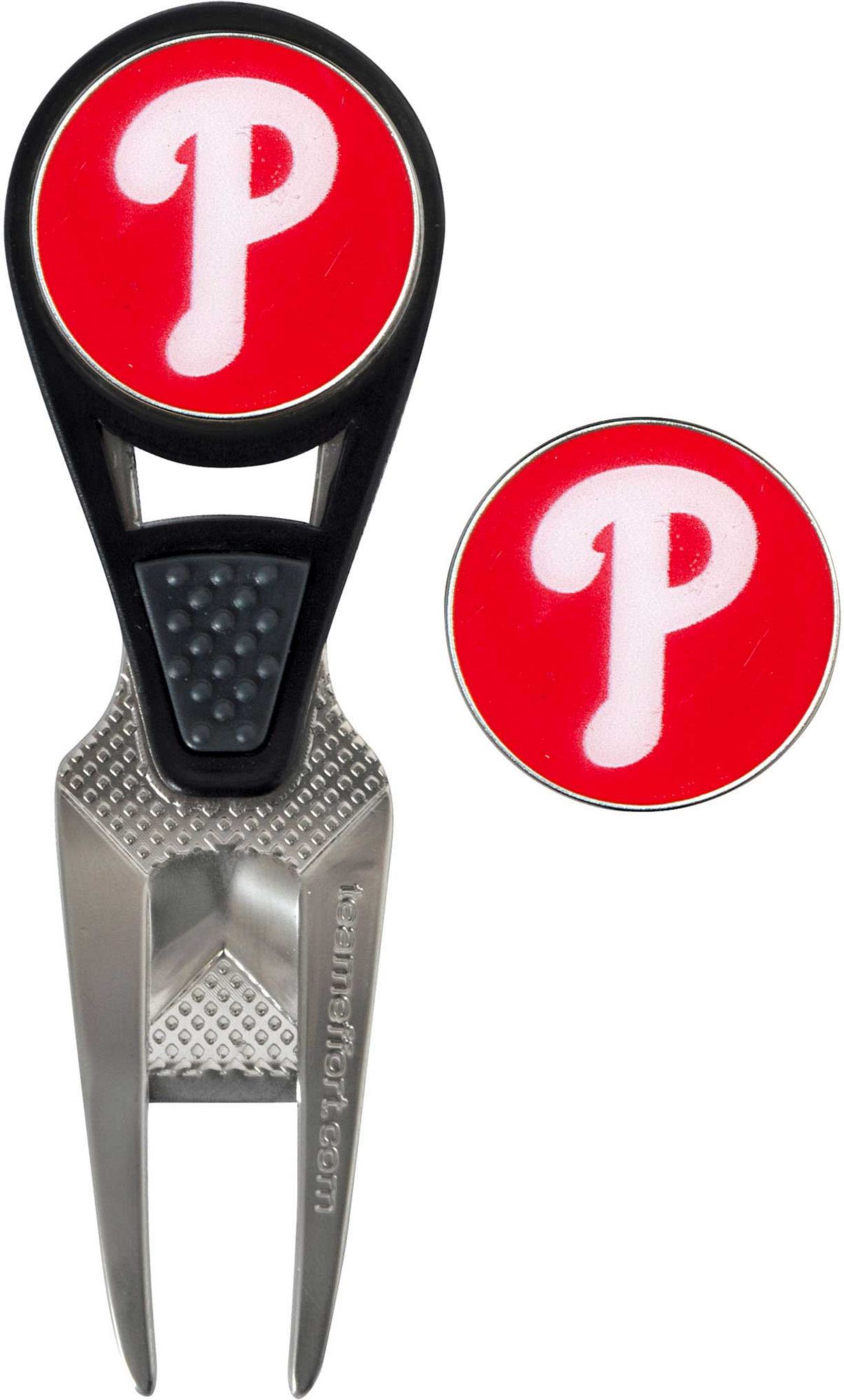 Maintain the green and your sense of Phillies pride with the Team Effort Philadelphia Phillies CVX Divot Tool and Ball Marker Set. The patented CVX tool features an ergonomic construction, custom contoured rails and a textured thumb indent for maximum comfort during use. Two 25mm, iron stamped ball markers feature team trademarks and sit within the magnetic housing on the front of the tool for at hand convenience. Leave no doubt as to your support for the Phillies with this officially licensed divot tool.