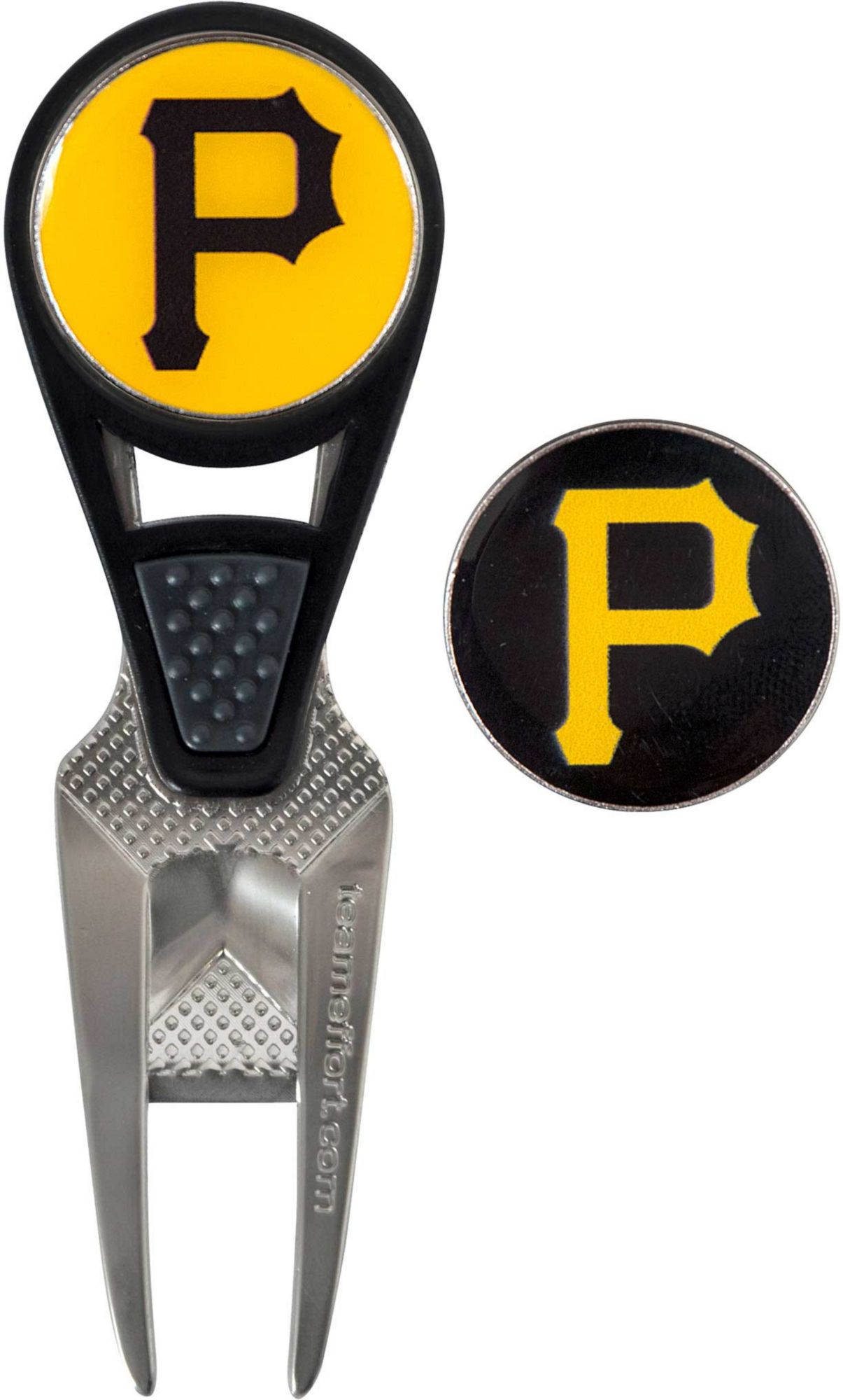 Maintain the green and your sense of Pirates pride with the Team Effort Pittsburgh Pirates CVX Divot Tool and Ball Marker Set. The patented CVX tool features an ergonomic construction, custom contoured rails and a textured thumb indent for maximum comfort during use. Two 25mm, iron stamped ball markers feature team trademarks and sit within the magnetic housing on the front of the tool for at hand convenience. Leave no doubt as to your support for the Pirates with this officially licensed divot tool.
