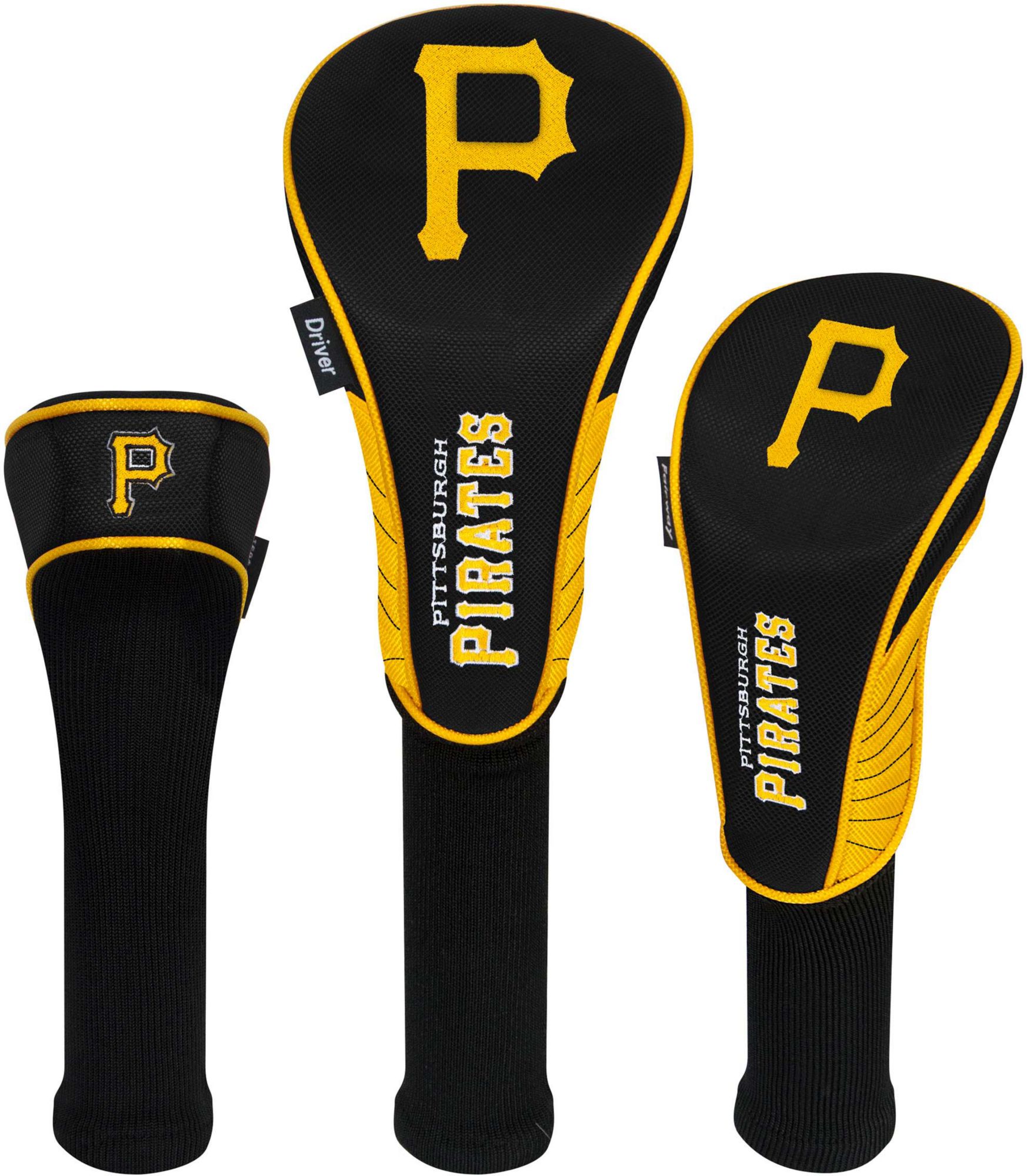 Boldly display your support for the Pirates by protecting your metalwoods with Team Effort Pittsburgh Pirates Headcovers. Specifically designed to fit most driver, fairway wood and hybrid models, each premium headcover is constructed of rugged 420D nylon material and features a long neck design to deliver maximum club protection. Vibrant, contrasting team color elements combine with multiple team trademark embroideries to show your course mates who back on game day.