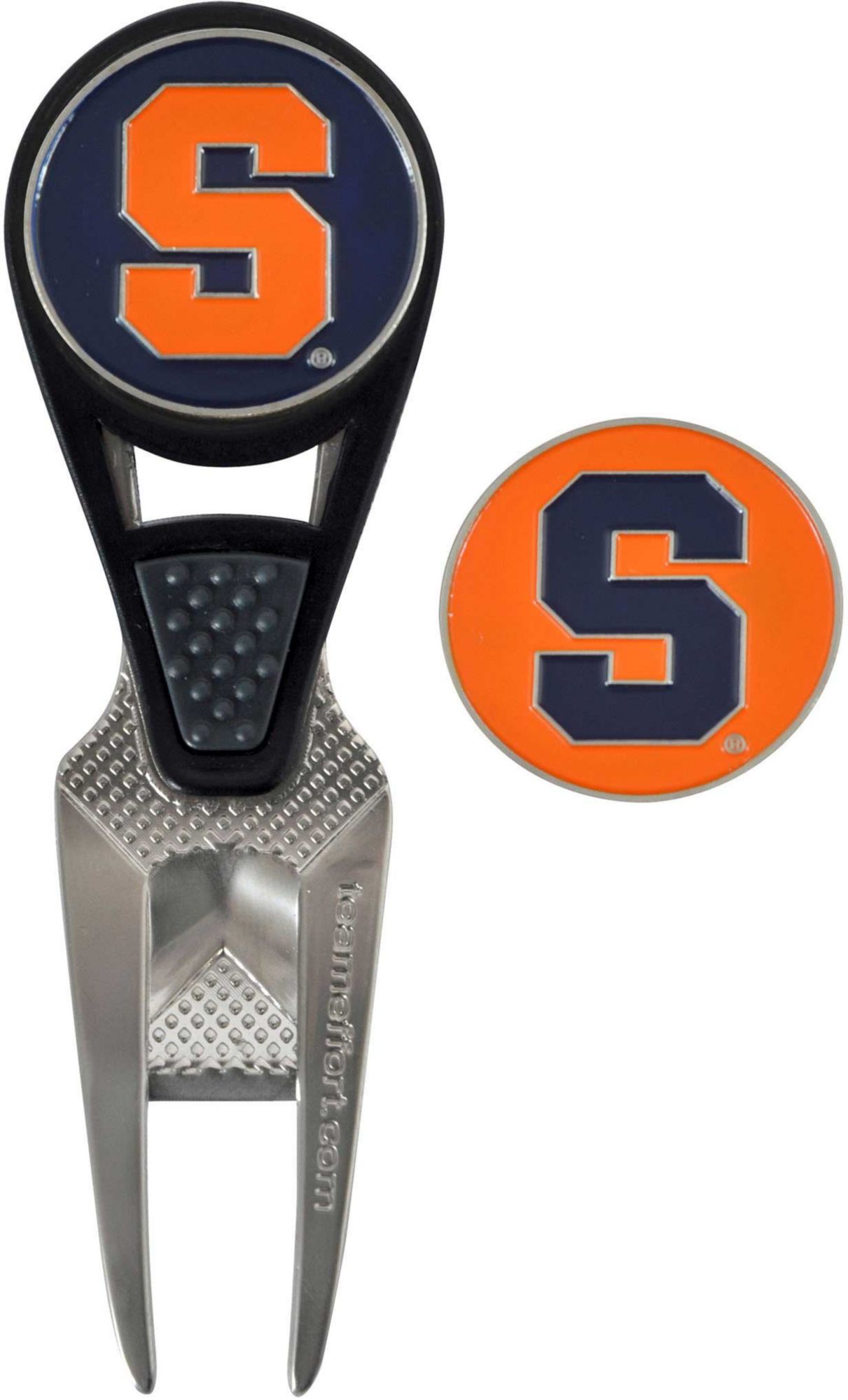 Maintain the green and your sense of Orange pride with the Team Effort Syracuse Orange CVX Divot Tool and Ball Marker Set. The patented CVX tool features an ergonomic construction, custom contoured rails and a textured thumb indent for maximum comfort during use. Two 25mm, iron stamped ball markers feature team trademarks and sit within the magnetic housing on the front of the tool for at hand convenience. Leave no doubt as to your support for the Orange with this officially licensed divot tool.