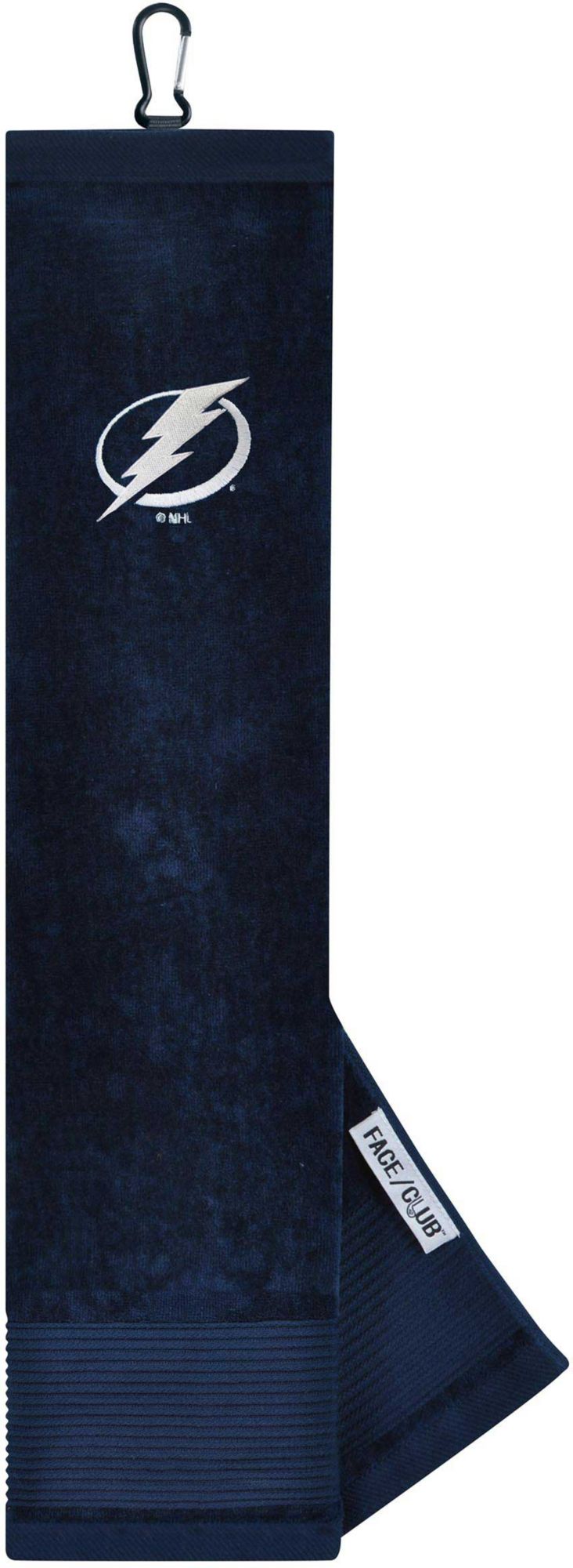 Ingenuity meets versatility to form the Team Effort Tampa Bay Lightning Embroidered Face/Club Tri-Fold Towel. This dual-textured towel features woven ribs designed to remove dirt from your clubs and a highly absorbent, sheared velour panel to wick away moisture. A carabineer clip located on top secures the towel to your bag or cart for maximum convenience. A boldly embroidered, full-color team trademark shows everyone on the course your support for the Lightning .