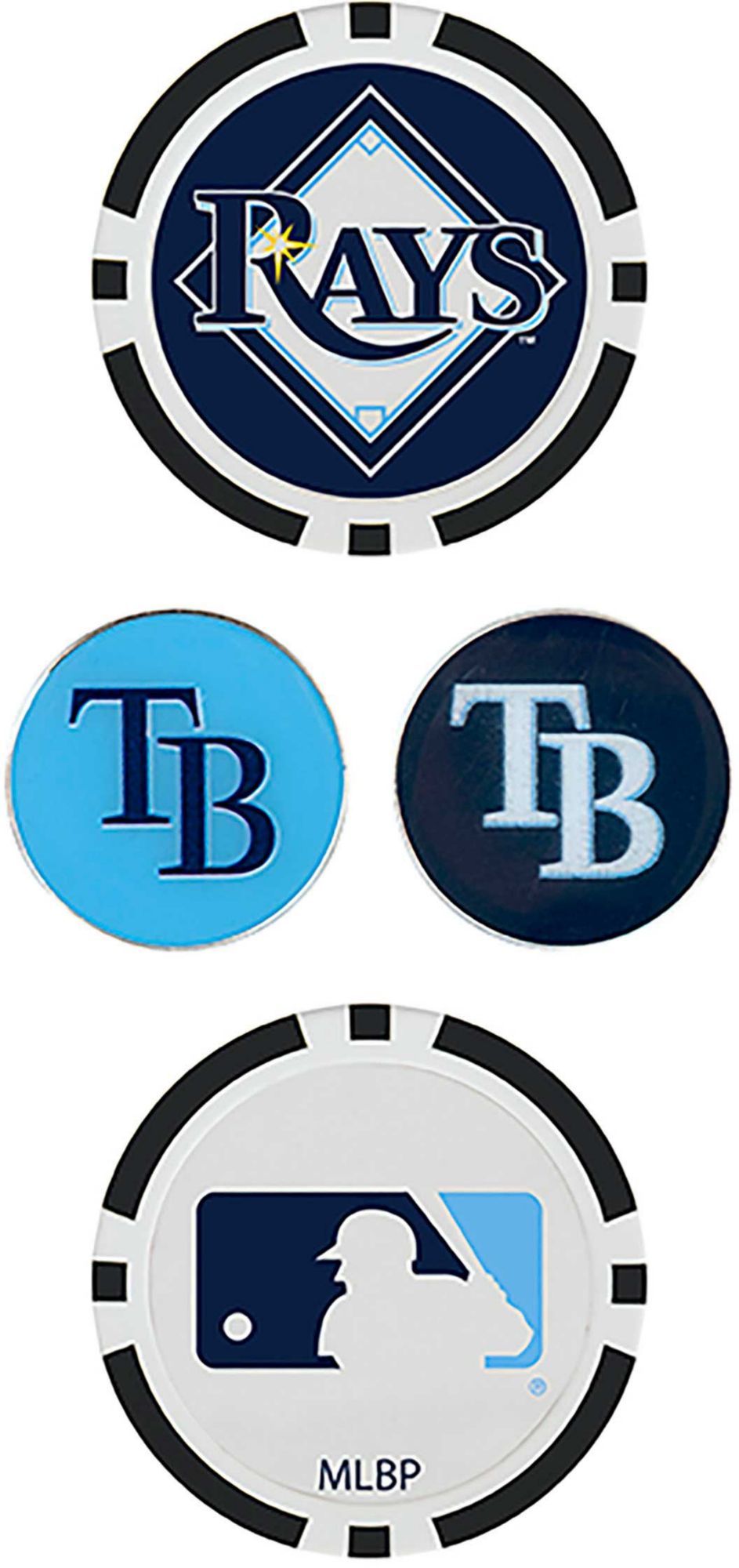 Remind your course mates of your pride in the Rays as you prepare for your putt with the Team Effort Tampa Bay Rays Ball Marker Set. Two 40mm poker chip style ball markers feature multiple team trademarks and provide an eye-catching take on alignment. Two 25mm iron stamped ball markers feature a full-color team trademark and are suitable for use with most magnetic hat clips for convenience. Leave no doubt about your Rays spirit with this unique ball marker set.