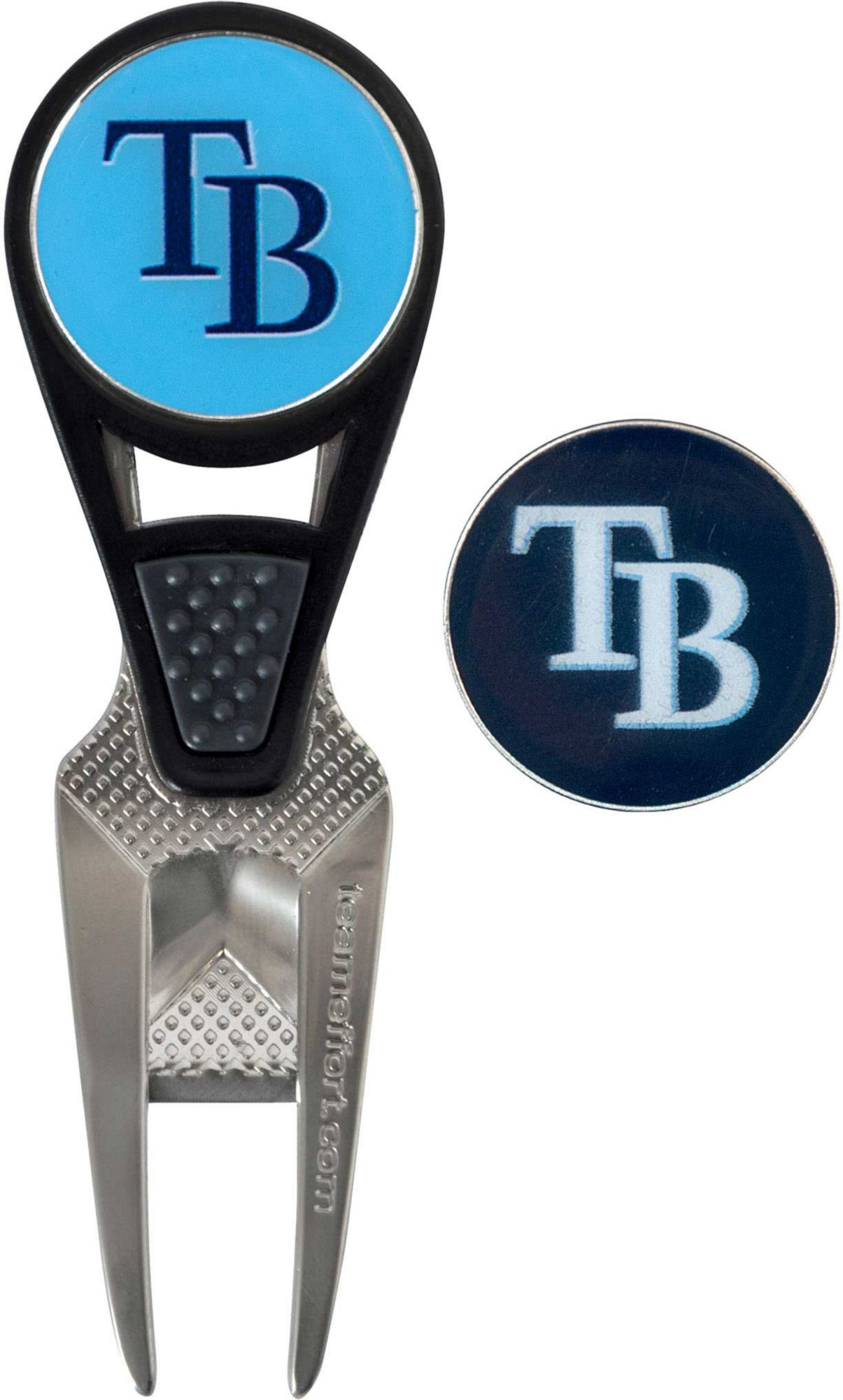 Maintain the green and your sense of Rays pride with the Team Effort Tampa Bay Rays CVX Divot Tool and Ball Marker Set. The patented CVX tool features an ergonomic construction, custom contoured rails and a textured thumb indent for maximum comfort during use. Two 25mm, iron stamped ball markers feature team trademarks and sit within the magnetic housing on the front of the tool for at hand convenience. Leave no doubt as to your support for the Rays with this officially licensed divot tool.