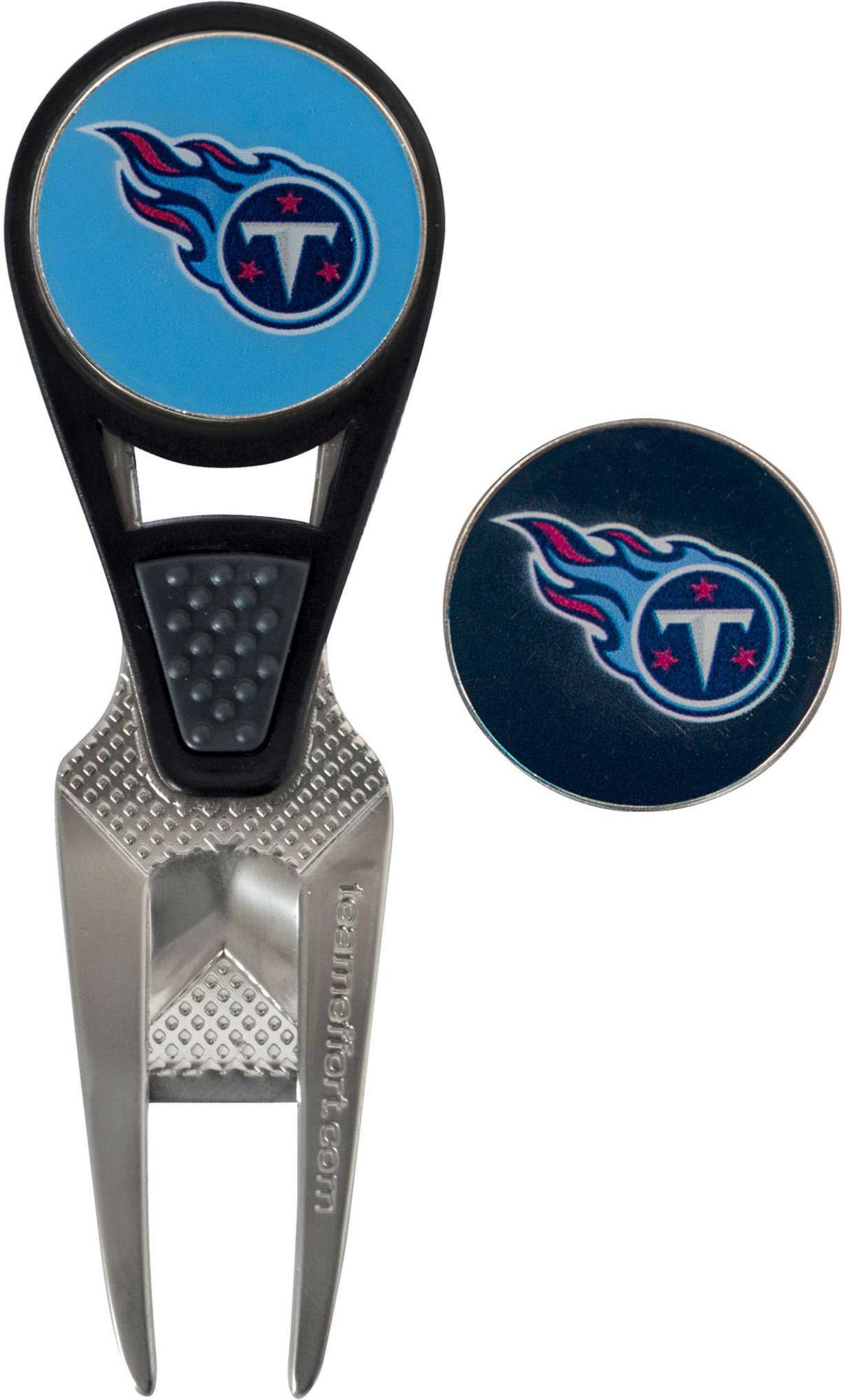 Maintain the green and your sense of Titans pride with the Team Effort Tennessee Titans CVX Divot Tool and Ball Marker Set. The patented CVX tool features an ergonomic construction, custom contoured rails and a textured thumb indent for maximum comfort during use. Two 25mm, iron stamped ball markers feature team trademarks and sit within the magnetic housing on the front of the tool for at hand convenience. Leave no doubt as to your support for the Titans with this officially licensed divot tool.