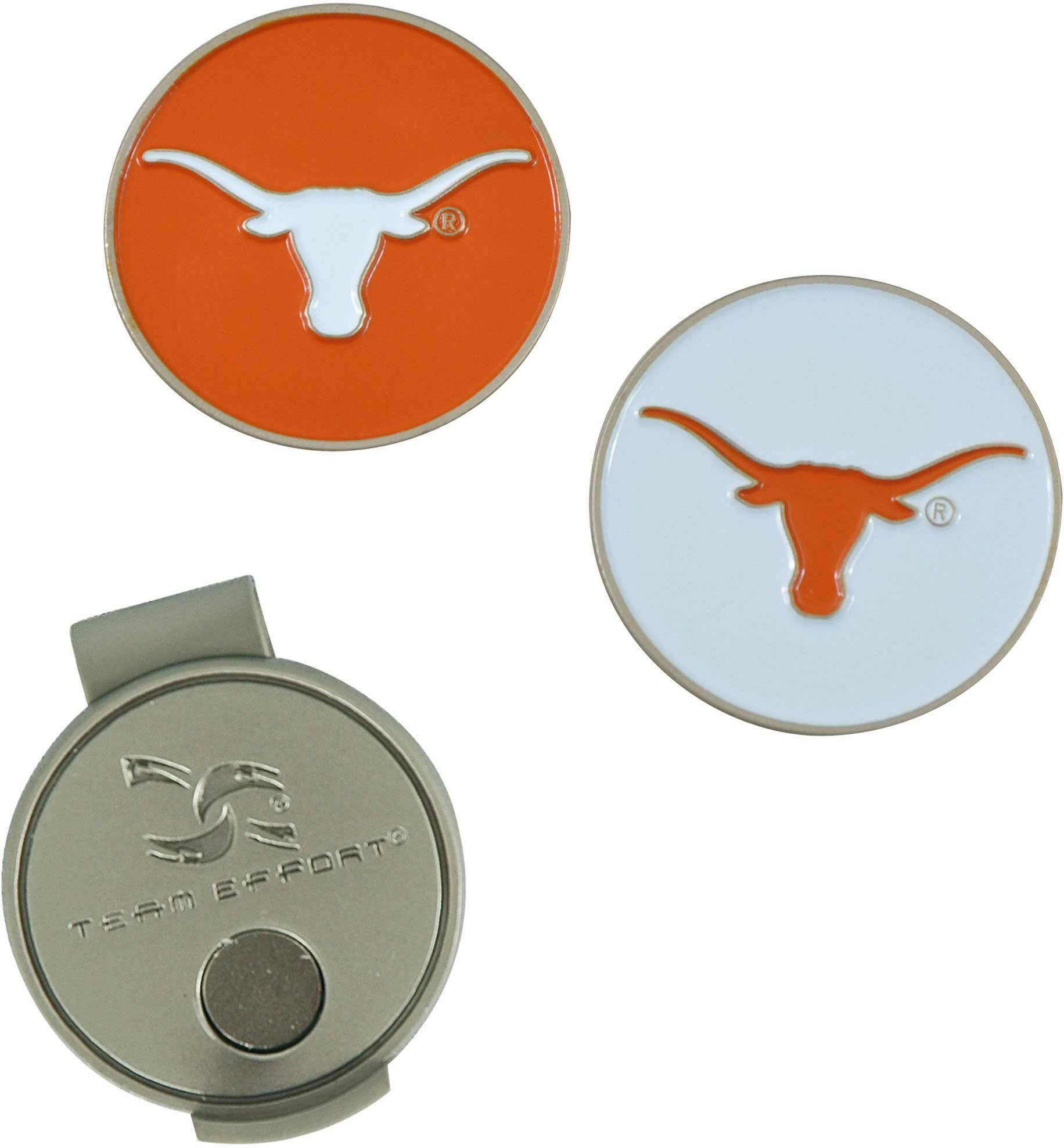 Show Longhorns loyalty during your pre-putt routine with the Team Effort Texas Longhorns Hat Clip and Ball Markers Set. Designed to securely fix to the brim of most caps and visors, the cap clip features a nickel finish for long-lasting durability. Two interchangeable, iron-stamped ball markers feature full-color team trademarks designed to add a touch of Longhorns flair to your look. After your putt, the magnetic markers easily attach to the cap clip for hassle-free use.